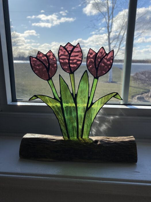 Stained Glass Tulip Bunch on Driftwood Base – Red   Â