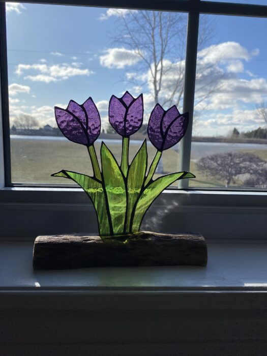 Stained Glass Tulip Flower Bouquet inlaid on driftwood base – Purple    Â