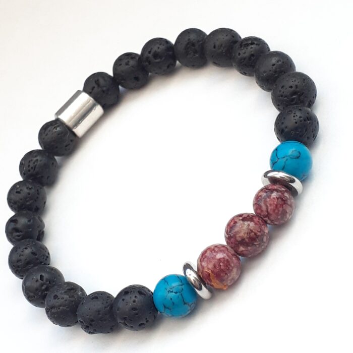 Turquoise Howlite and Red Stone Bead Black Lava Stretch Bracelet