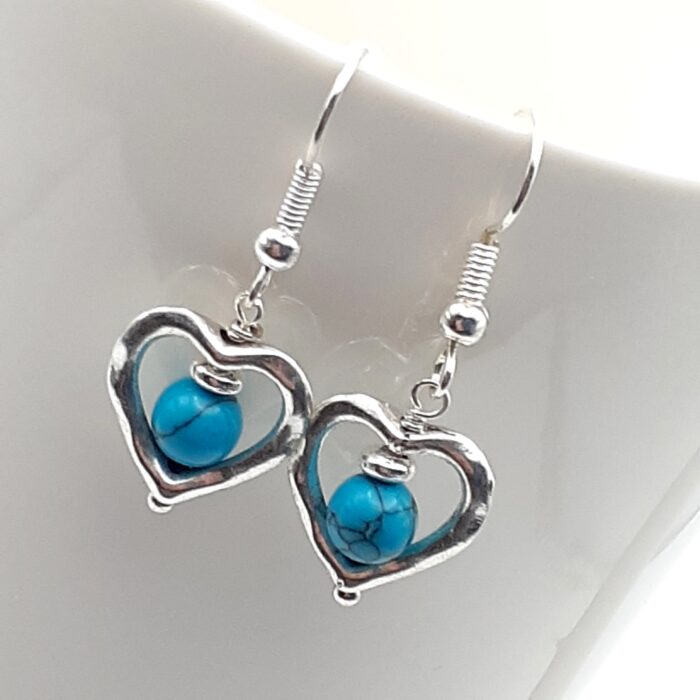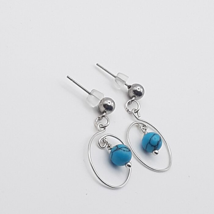 Tiny hoop post-style earrings in a swirl design with blue howlite turquoise beads.