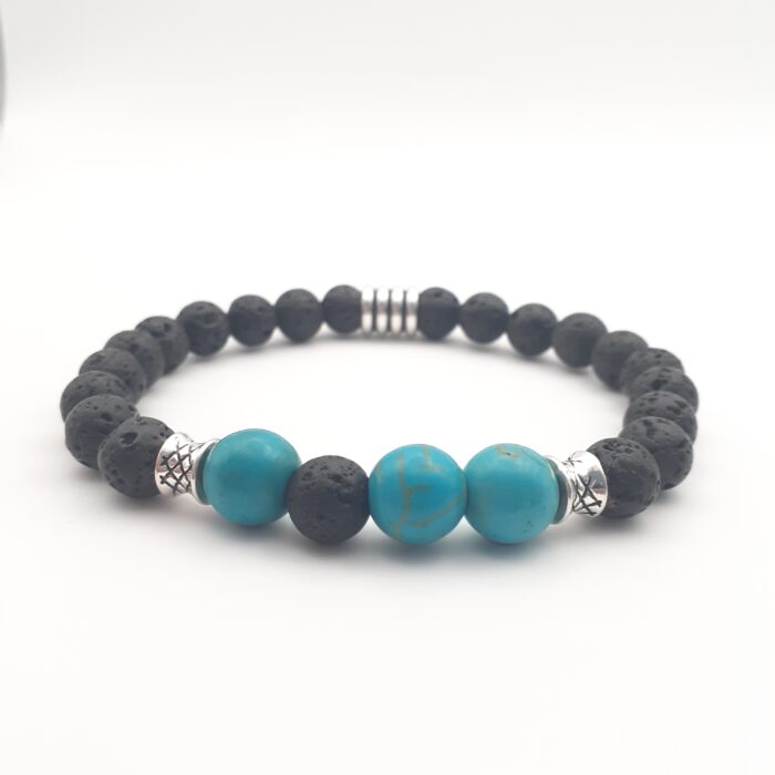 Turquoise Blue Howlite and Black Lava Stone Beaded Stretch Bracelet
