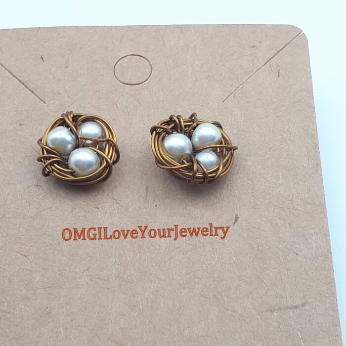 Tiny Copper Colour Wire Wrapped Pearls Bird Nest Post Stud Style Earrings