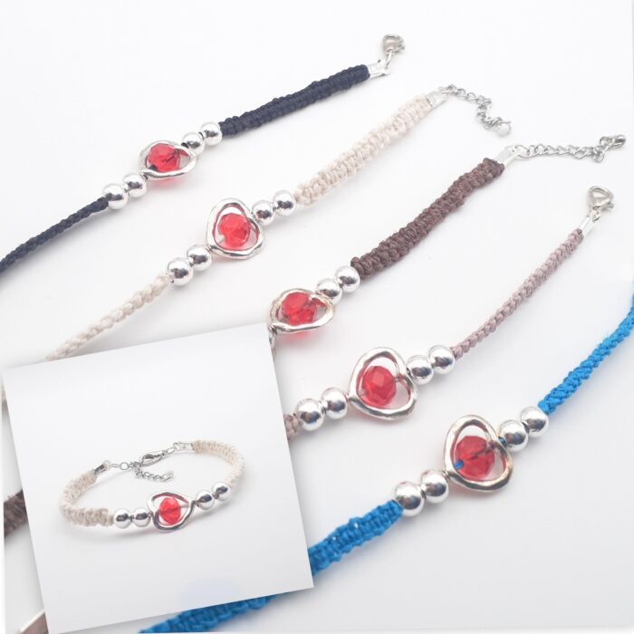 White Hemp Macrame Thin Cord Bracelet with a Red Faceted Crystal inside a Metal Heart Charm