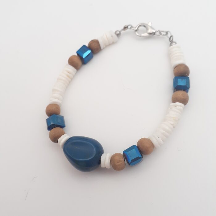 Blue Bead and Glistening Cube Glass Crystal Beads with White Heishi Beads and Natural Wood Beaded Bracelet