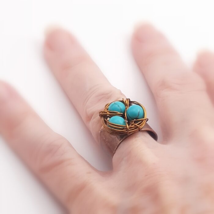 Copper Bird Nest Ring Wire Wrapped with Turquoise Howlite Beads Adjustable Wide Band