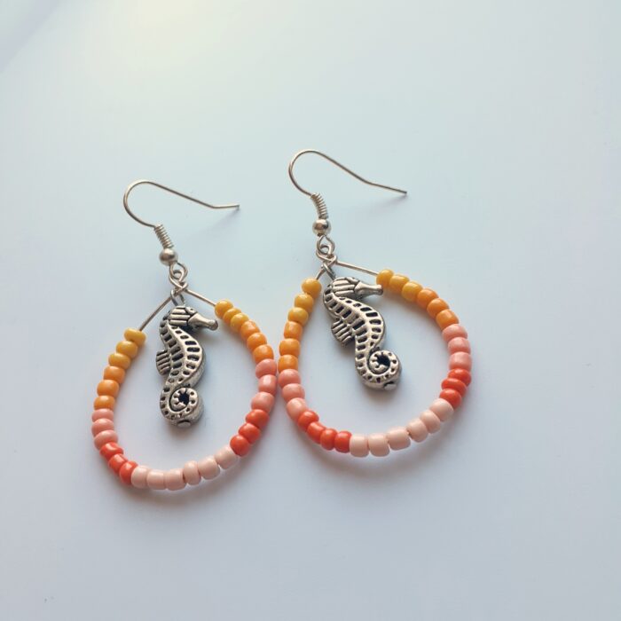 Coral Seed Bead Hoop Earrings with 3D Tibetan Silver Seahorse Charms