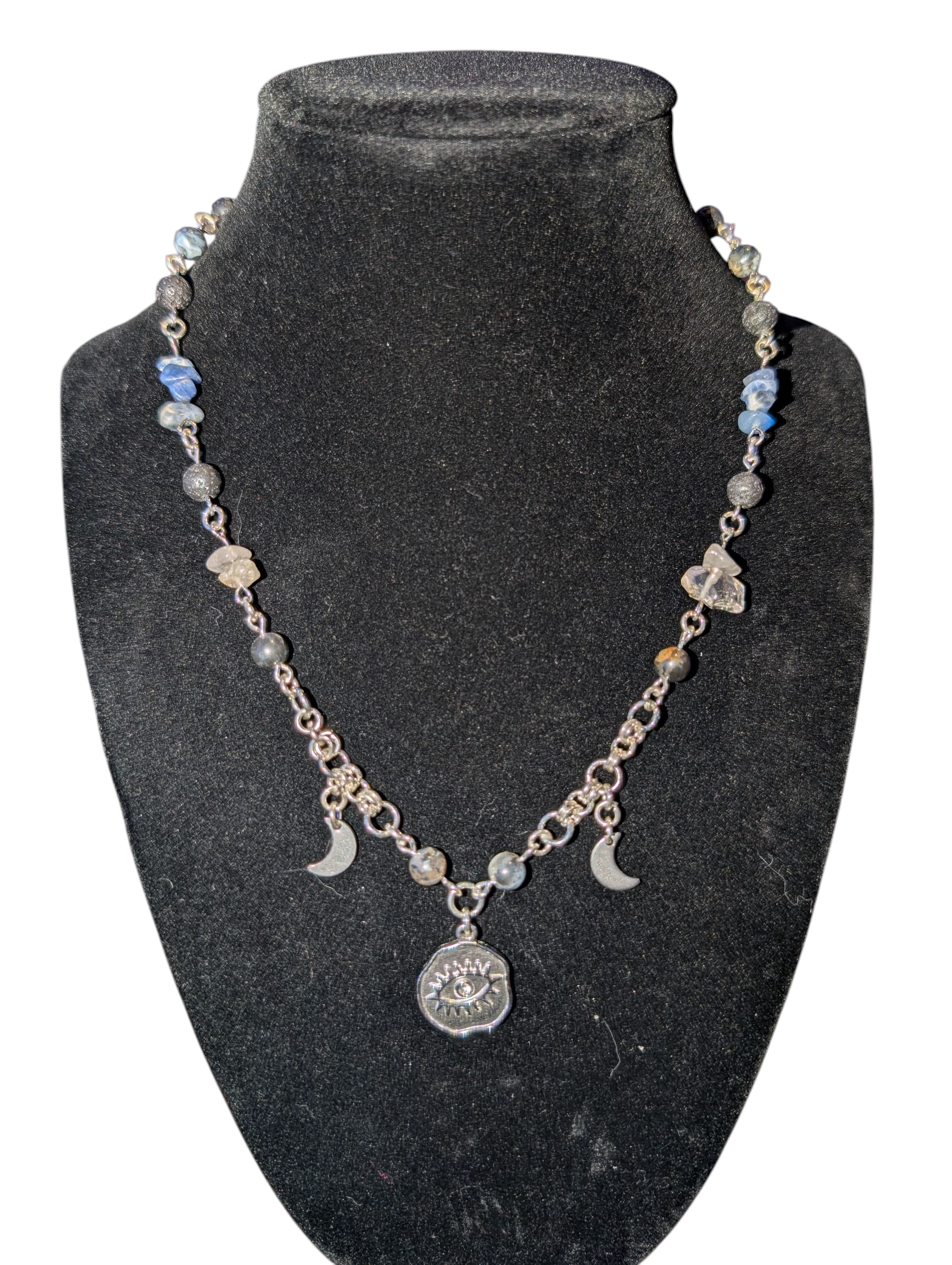 An eye pendant held by semi-chain-mailed strains, and various gemstone chips. This all-seeing necklace is wonderful for anyone looking to add some celestial and cosmic charm to their look.