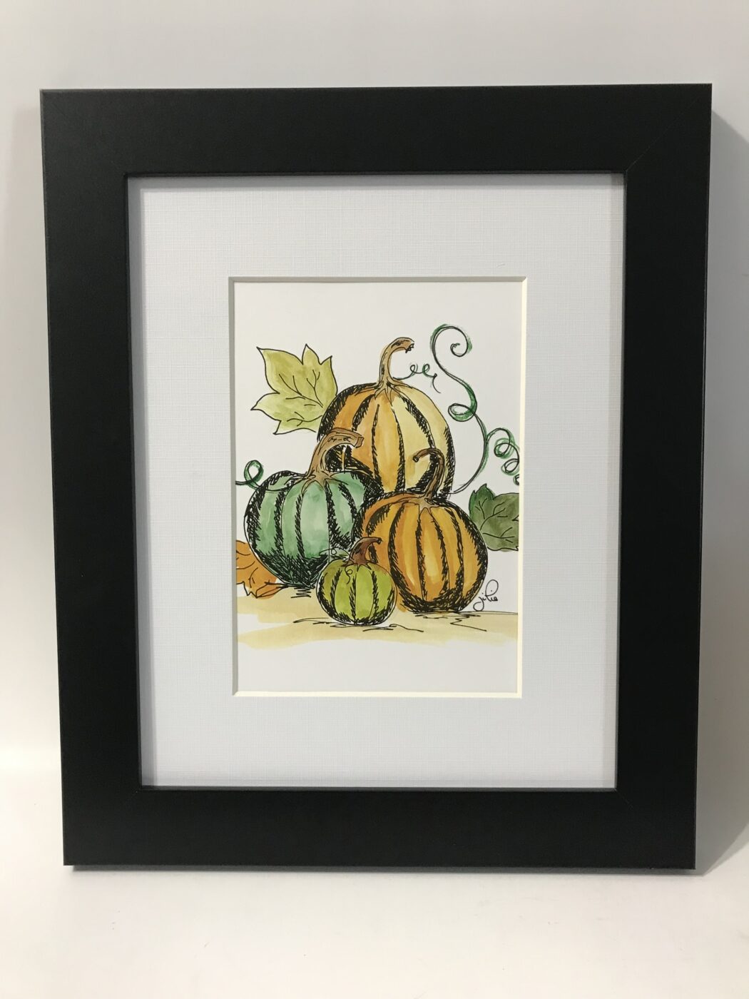 Part of my Autumn Collection. This piece captures the soft and cozy colours of Autumn, featuring a cluster of pumpkins in the warm Autumn tones. The message. Such a perfect decor piece for the harvest season and beyond. Micron ink pen and watercolour design.