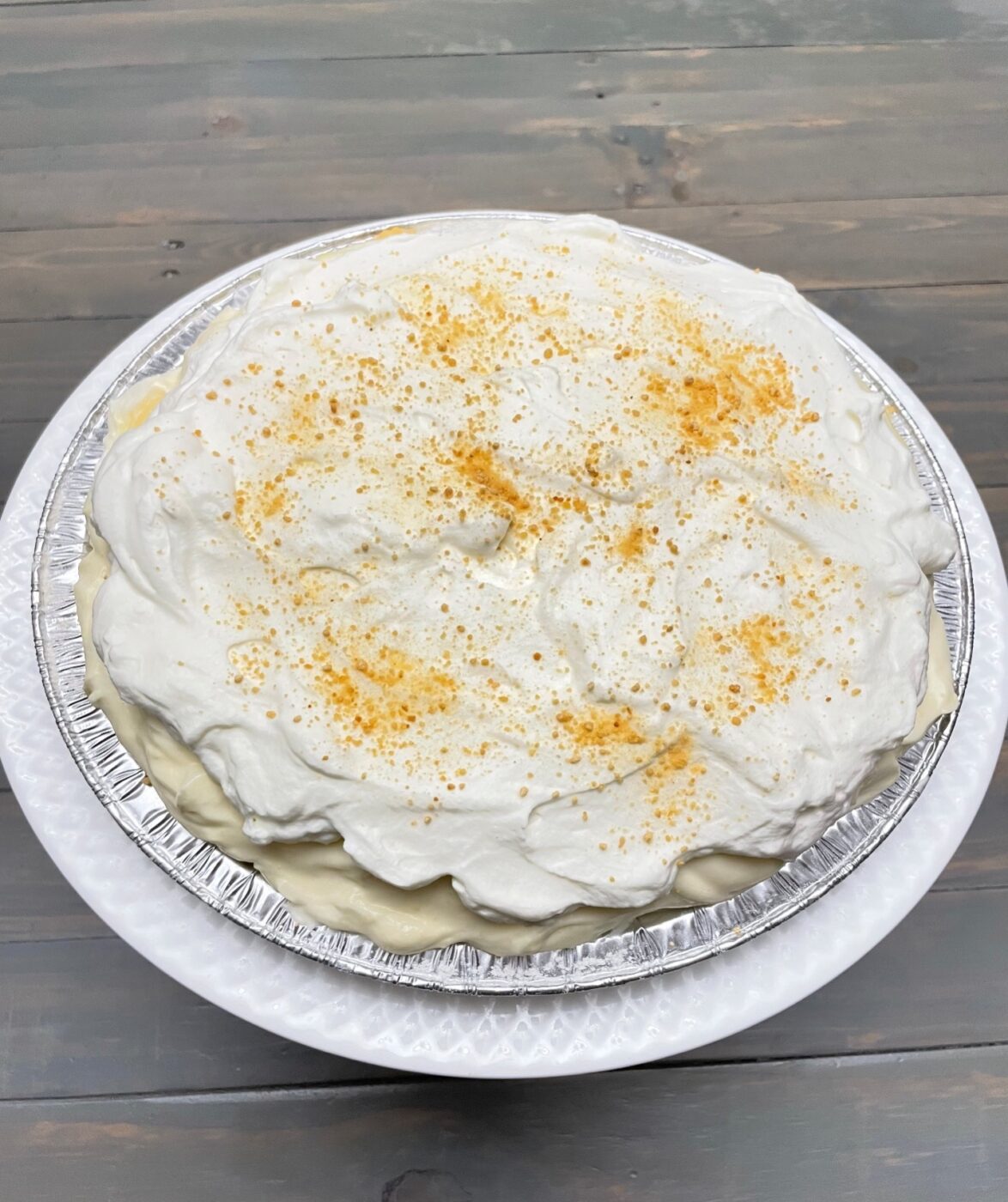 9″ pie. Fresh bananas and vanilla custard, topped with fresh whipped cream. Each pie is made with a homemade flaky crust.