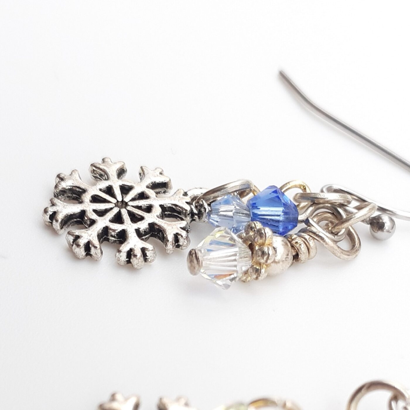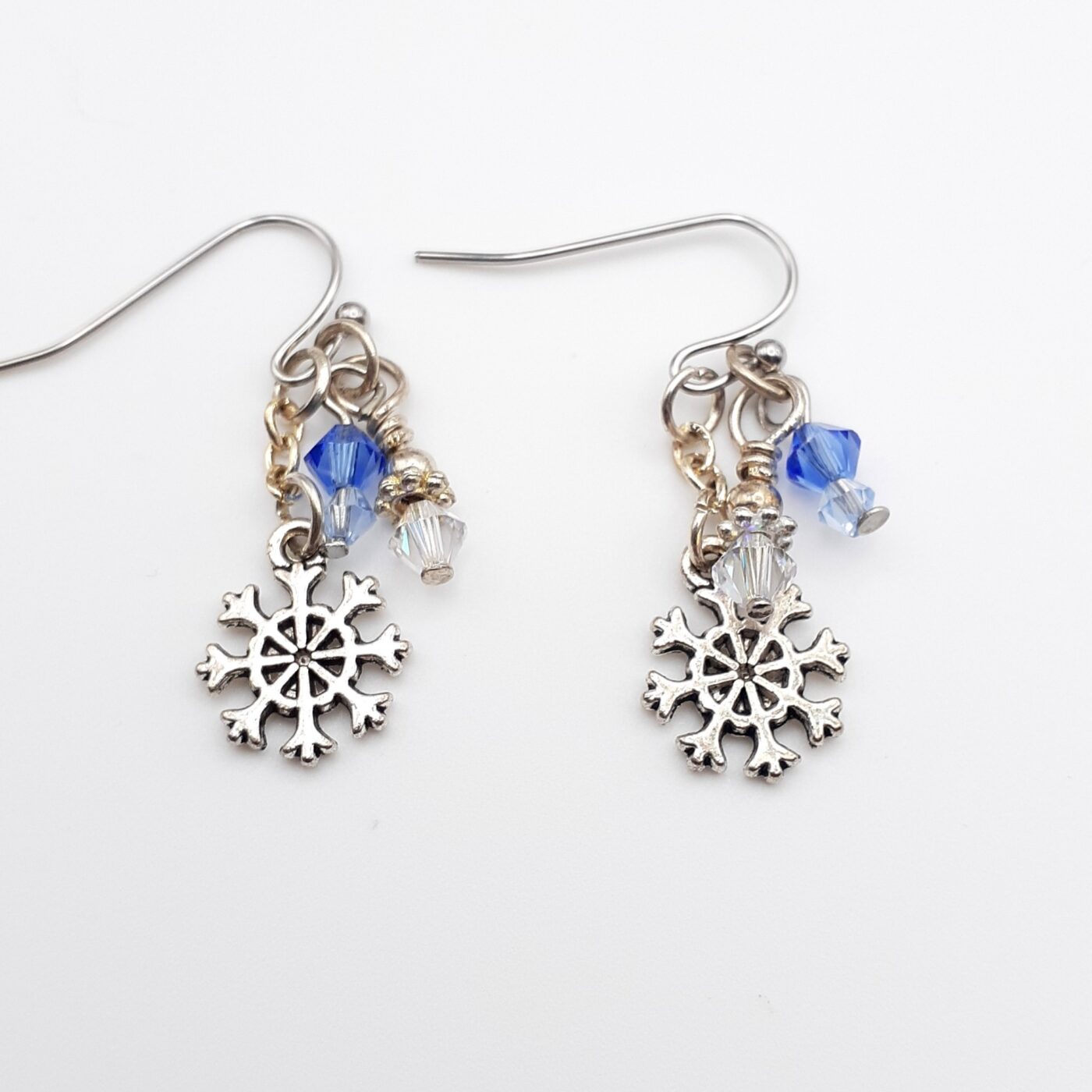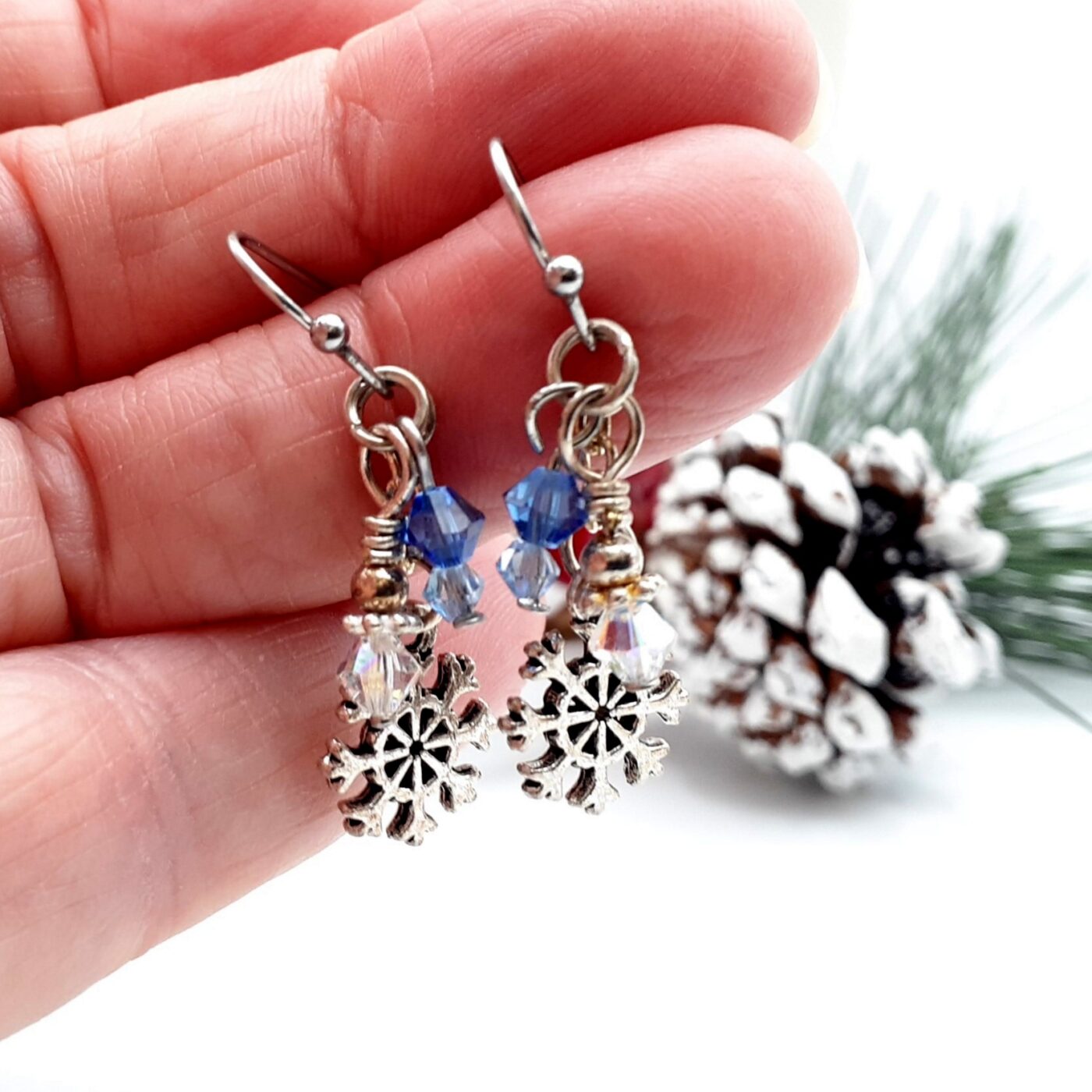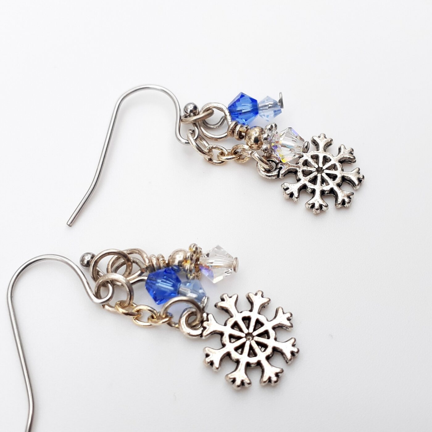 The cutest ever tiny snowflake charm earrings adorned with blue and crystal clear Swarovski’s. The cut and shine of Swarovski crystals is unmatched for brilliance and sparkle. The earrings measure 1 ½ inches from the top of the earwires. You’ll love these go-to earrings for your holiday season bling.