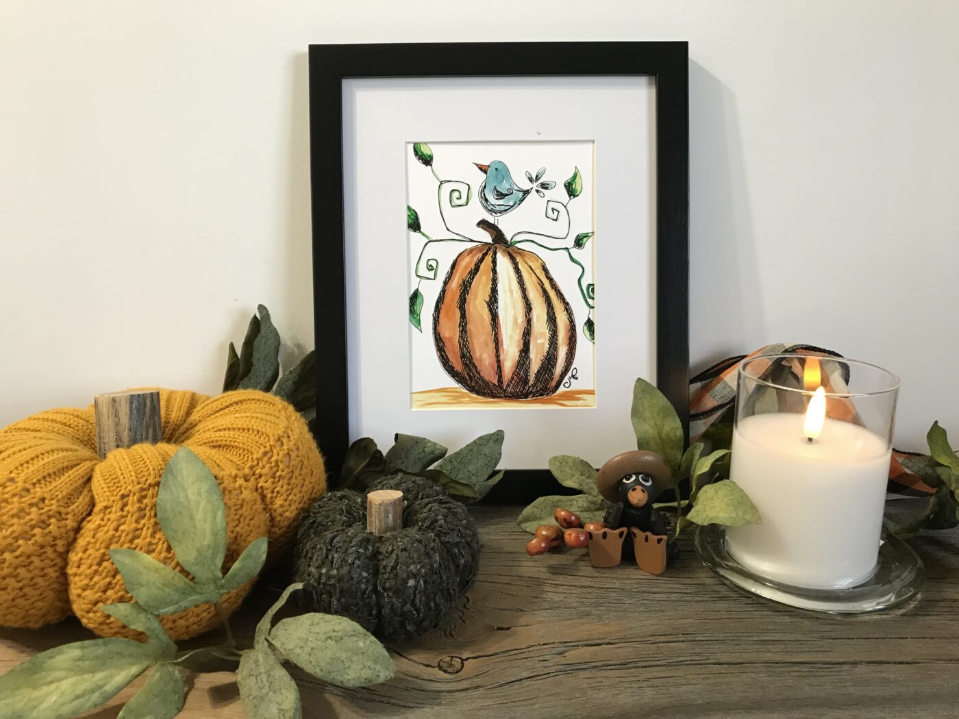 Part of my Autumn Collection. This piece captures the soft and cozy colours of Autumn, featuring a cute bluebird sitting on a single pumpkin in Autumn tones. Such a perfect decor piece for the harvest season and beyond. Micron ink pen and watercolour design.