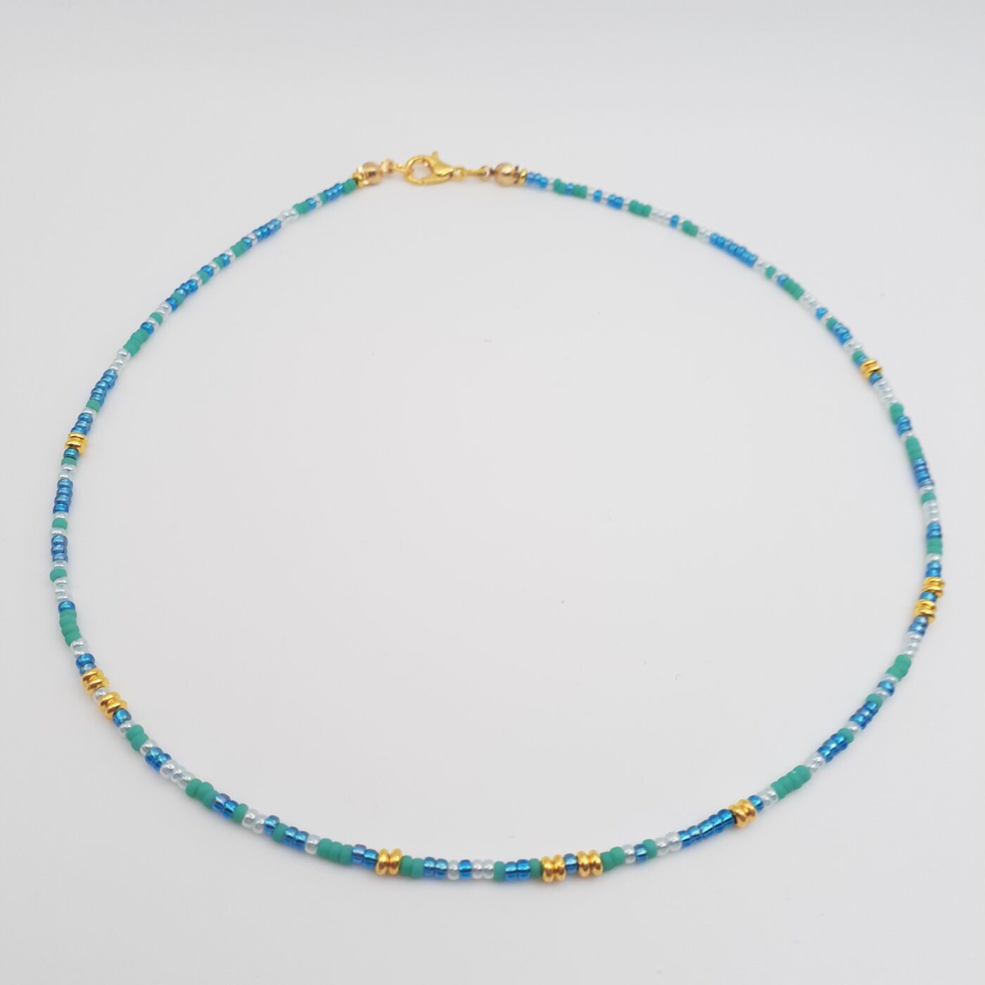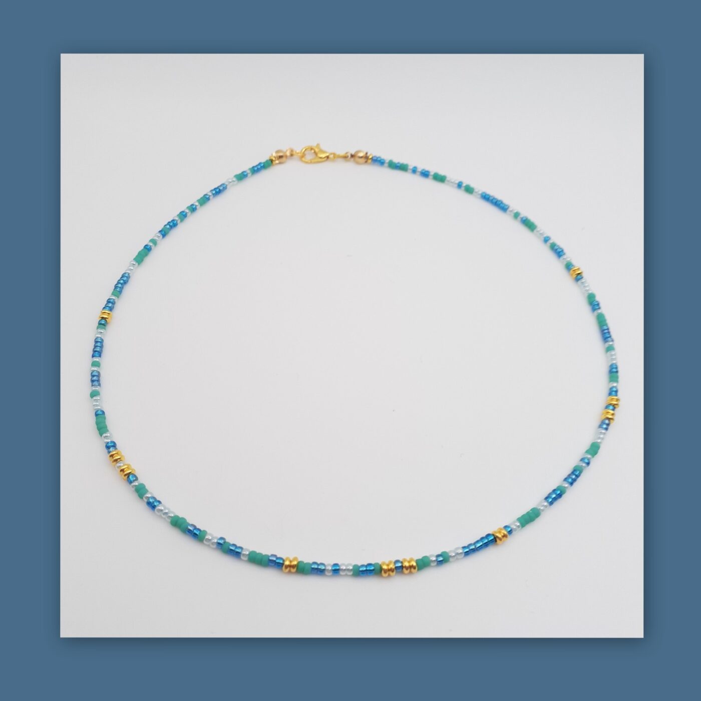 Blues and Gold Miyuki Glass Seed Bead Thin Minimalist style Short Necklace 16 inches