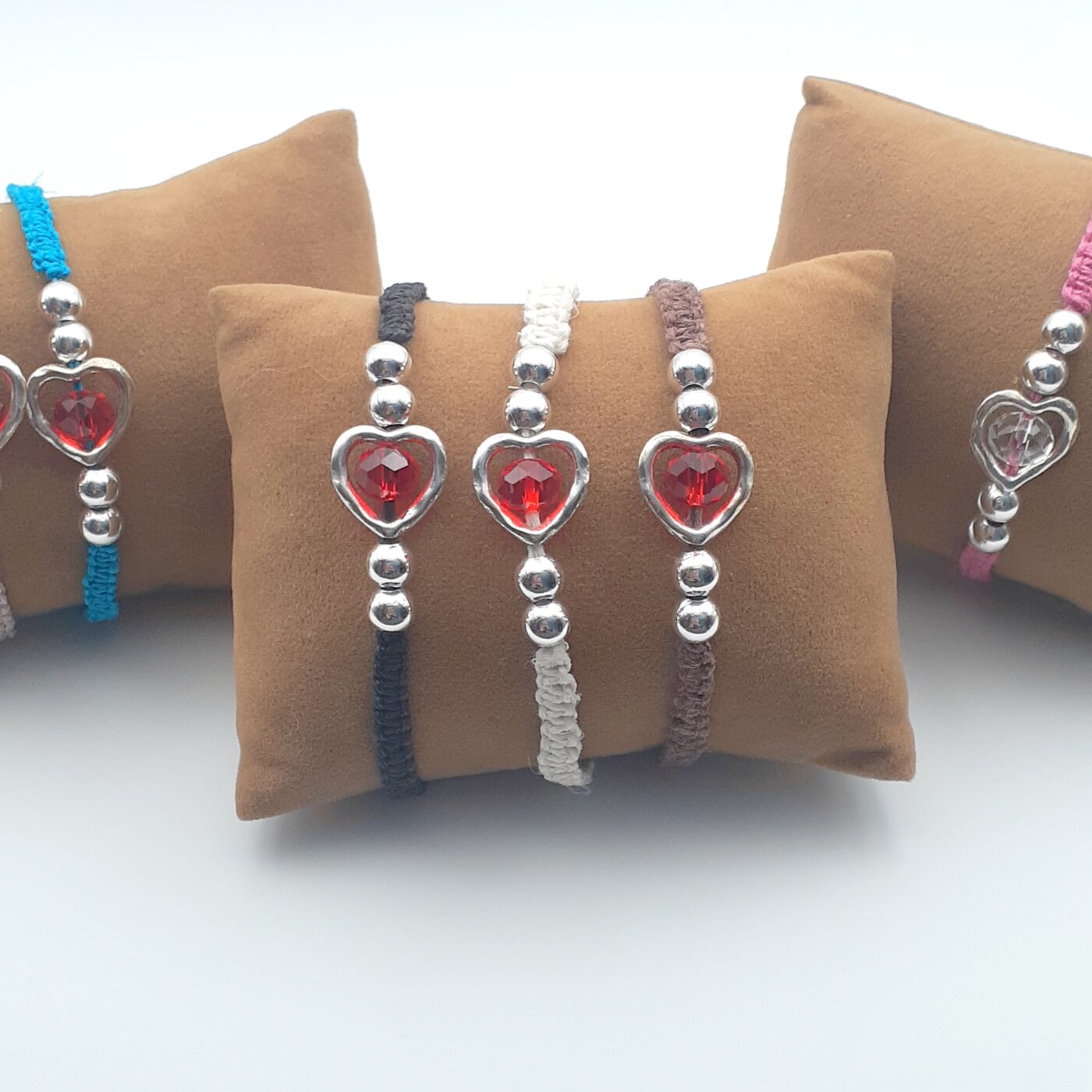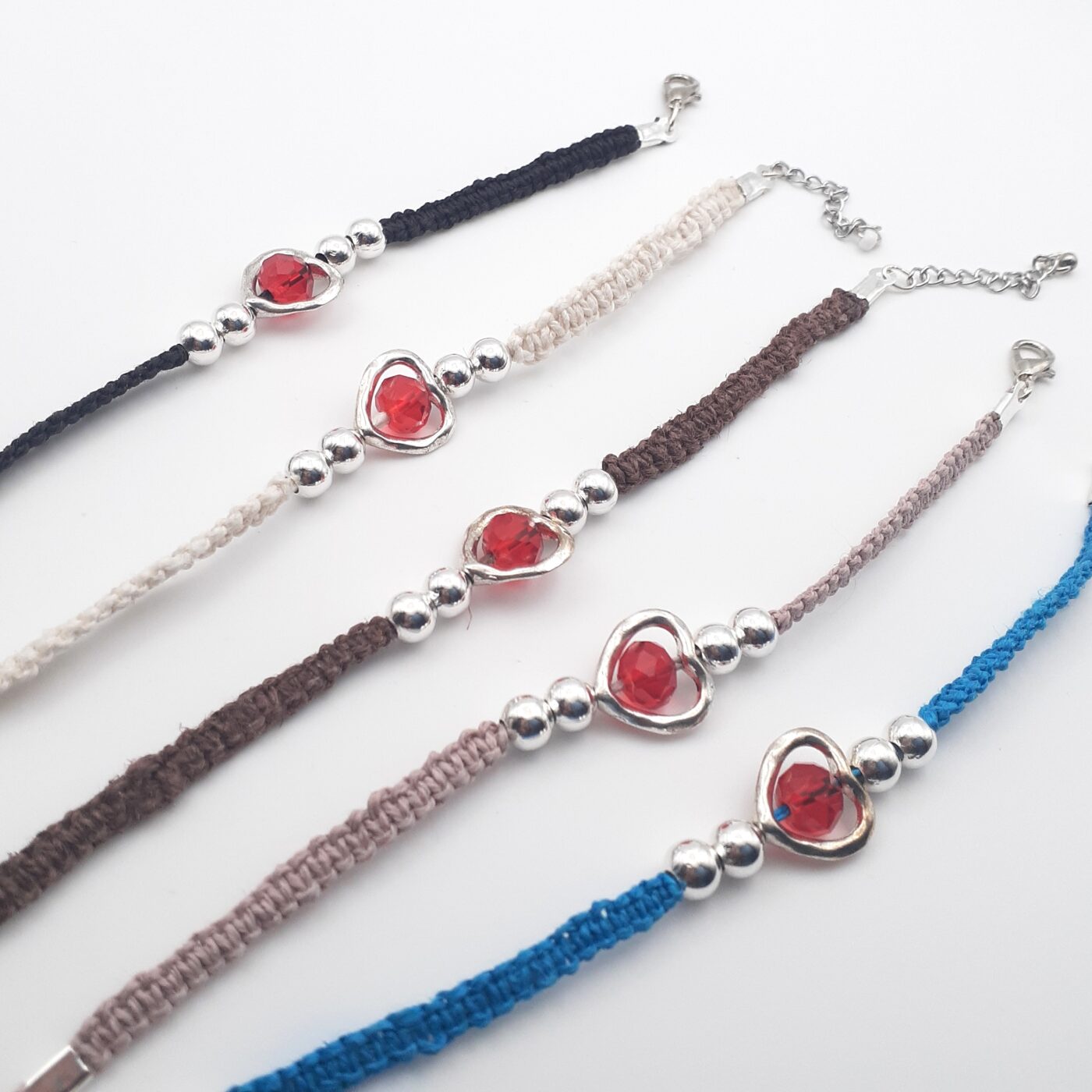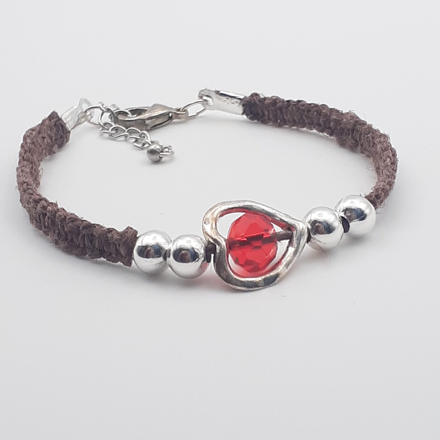 Brown Hemp Thin Bracelet with a Metal Open Heart-Shaped Charm with Red Faceted Crystal bead