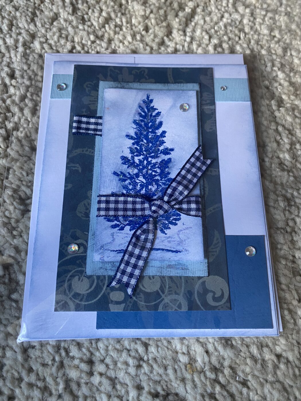 This festive card features a beautiful Christmas tree with pretty embellishments. This hand-made card uses a combination of mixed media, gem stones, ribbon, and a stamped saying. Printed on quality card stock. Watercolour additions and layers adds to the beauty of this piece. A special way to show someone you care with a piece that was made with care and love. Blank inside so you can customize your own sentiment. Includes an envelope.