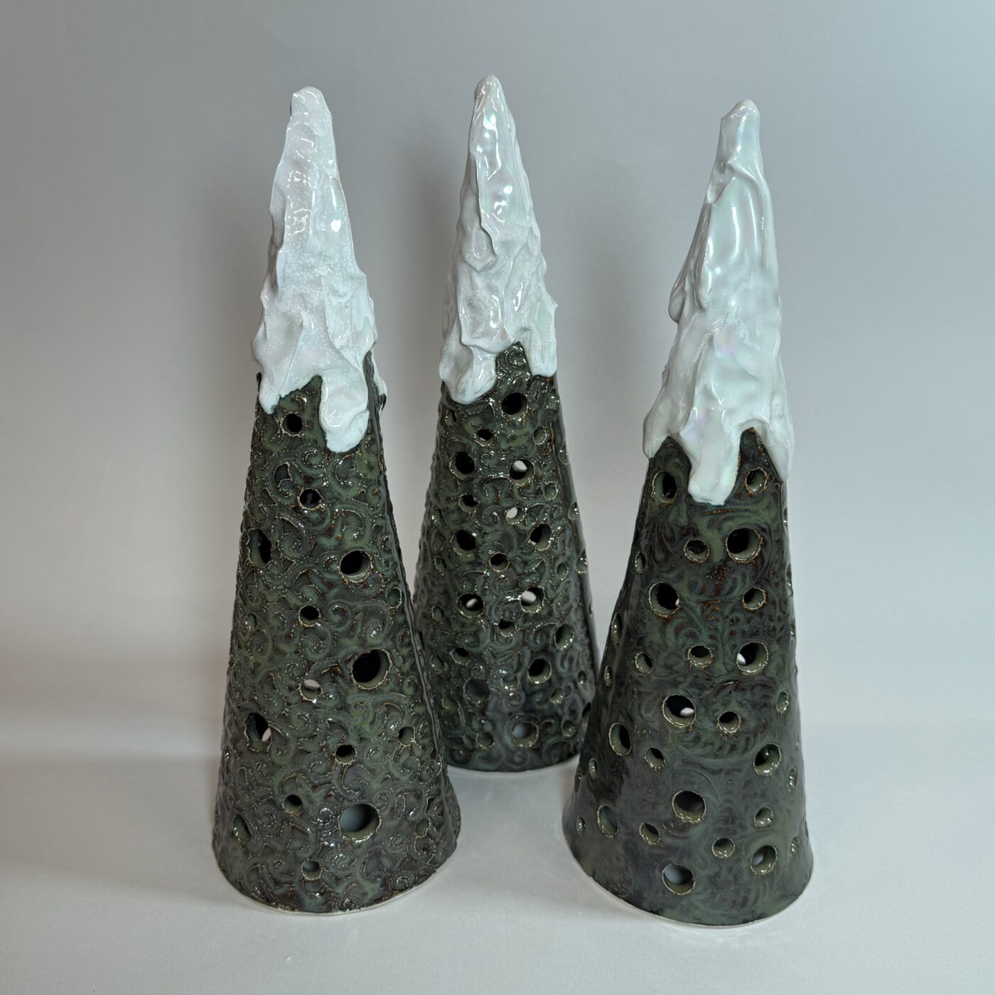 Hand crafted stoneware Christmas tree luminaires to add to your home décor for the holidays.  The snow covered tree tops are glazed in a mother of pearl luster for an added sparkle.  Add your own string of mini lights, or puck lights to light up the tree.