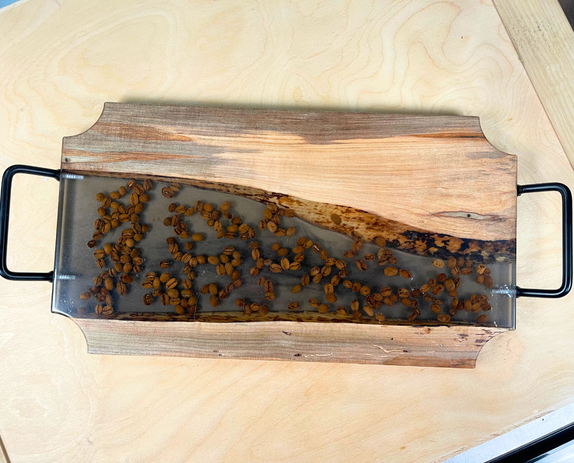 Handcrafted with real coffee beans set in epoxy, this board is both functional and eye-catching. Perfect for serving or display, it’s shown in ambrosia maple but each piece is unique, with natural variations in wood grain and colour. Measures approximately 10″ x 18″.