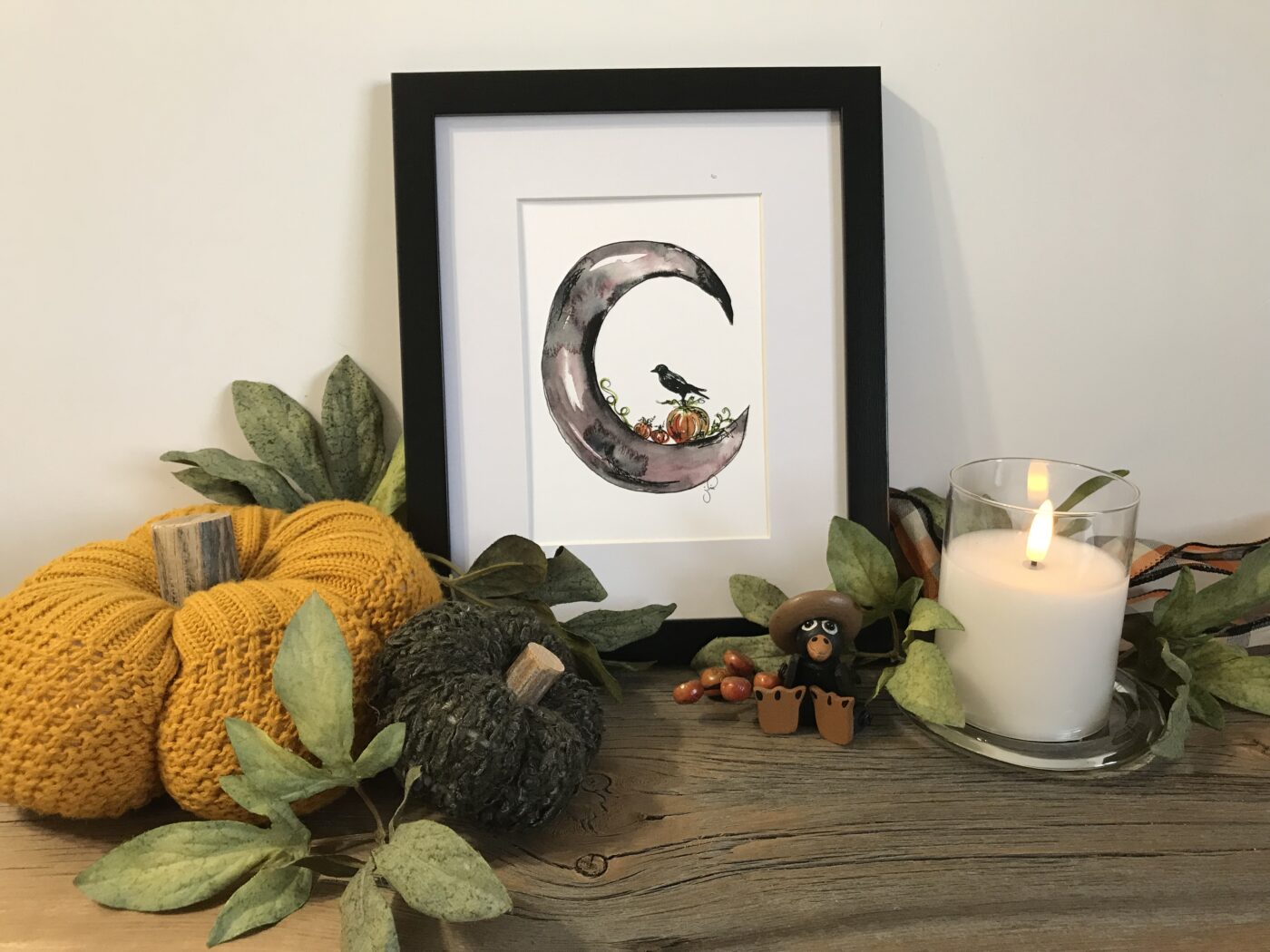 Part of my Autumn Collection. This piece captures the soft and cozy colours of Autumn, with a crow sitting upon a pumpkin, in a crescent moon. Such a perfect decor piece for the harvest season and beyond. Micron ink pen and watercolour design.