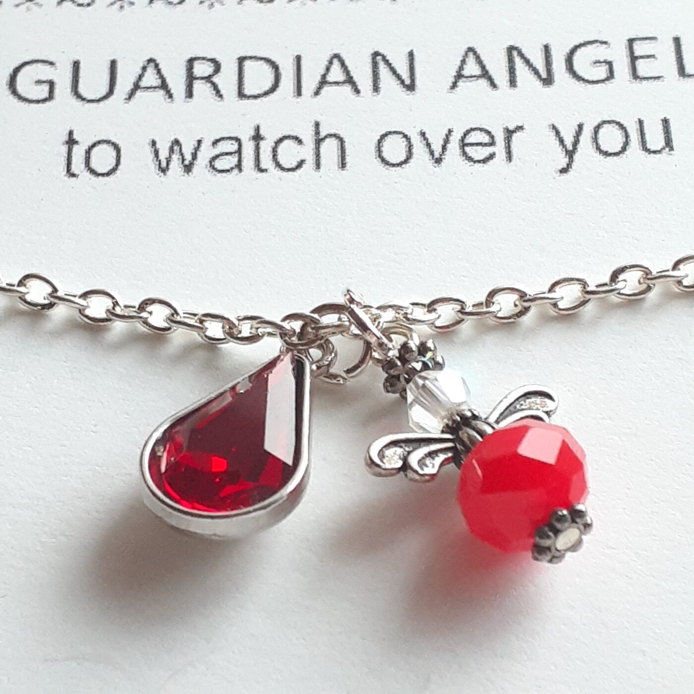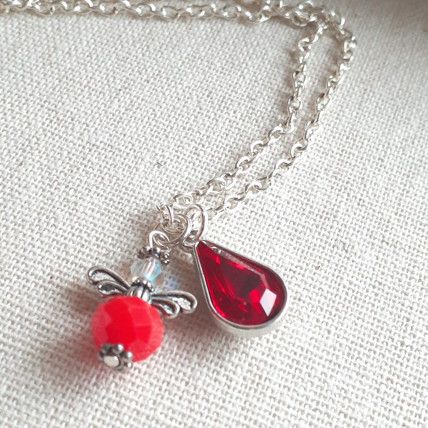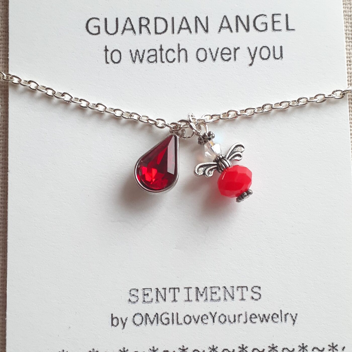 Sentiments Collection ~ Sterling silver Guardian Angel Necklace with a crimson red charm and angel handmade by me with Swarovski and Czech crystals. A guardian angel to watch over you. The sterling silver necklace measures 18.5 inches long but I can make it to suit. Please contact me.