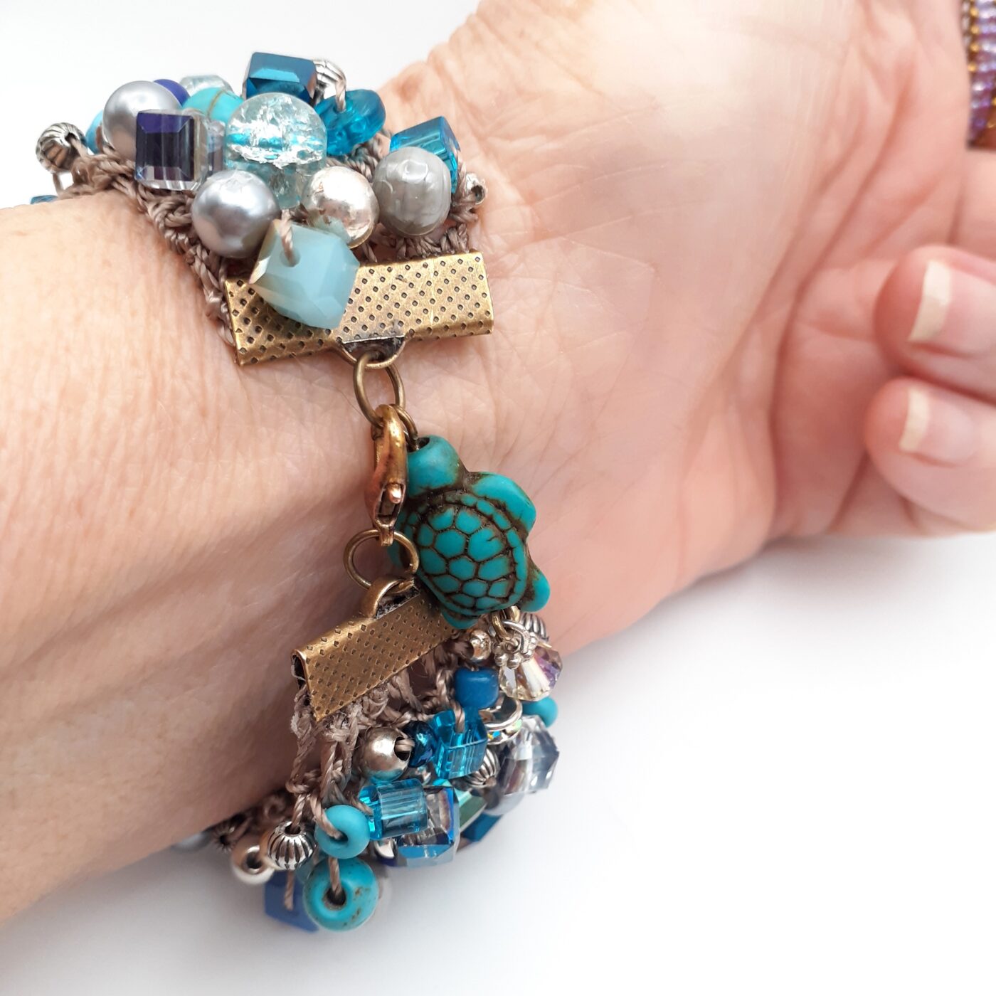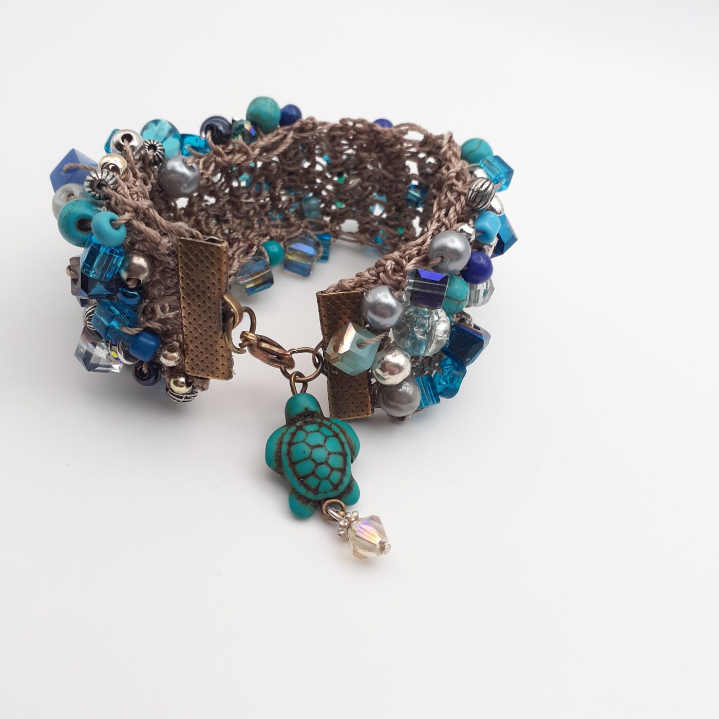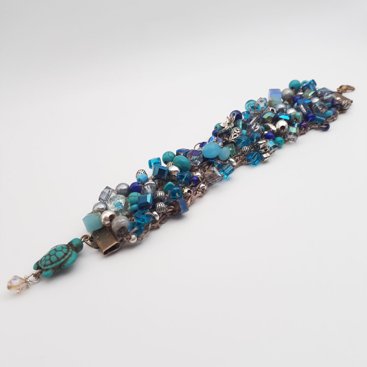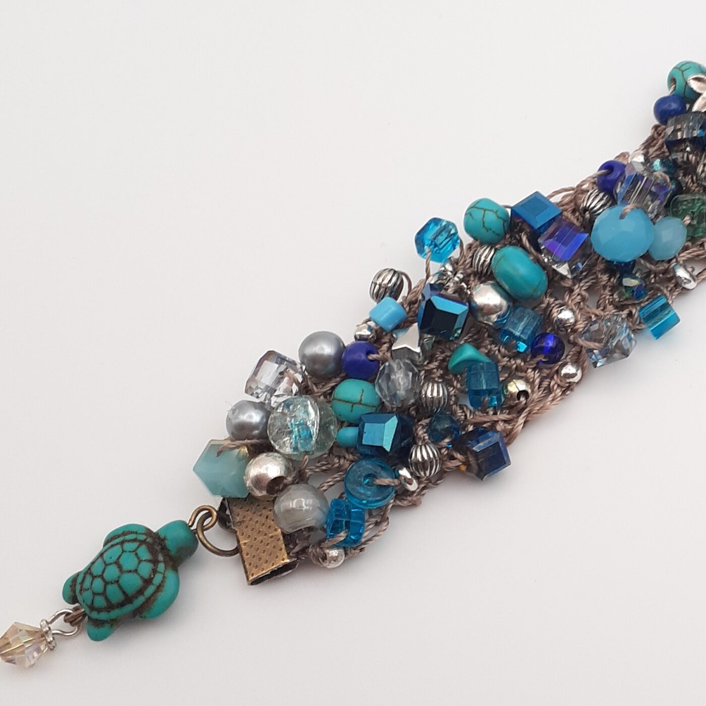 One of the most comfortable bracelets. Soft interior of crochet cotton holding beautiful random beaded blues in all shapes and sizes with accent beads in Tibetan silver. This bracelet measures approx. 1 inch across and 7 inches in length, and has a gorgeous turtle charm with a swarovski crystal. lt is like the turtle is swimming in an ocean of blue.