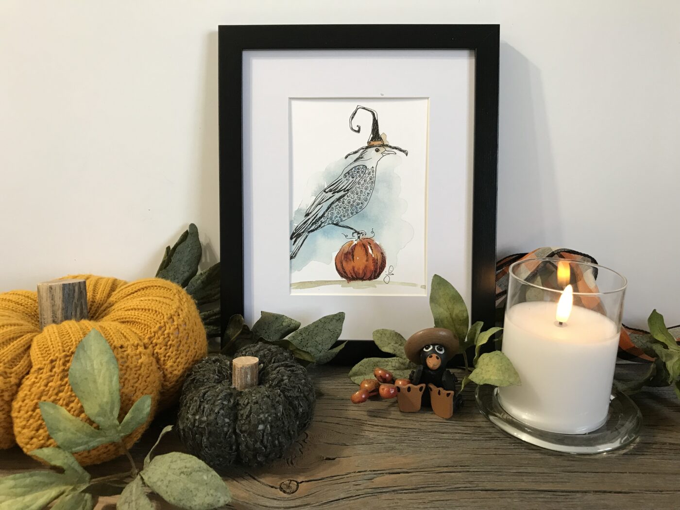 Part of my Autumn Collection. This piece captures the soft and cozy colours of Autumn, with a mysterious crow sitting upon a pumpkin. Such a perfect decor piece for the harvest season and beyond. Micron ink pen and watercolour design.