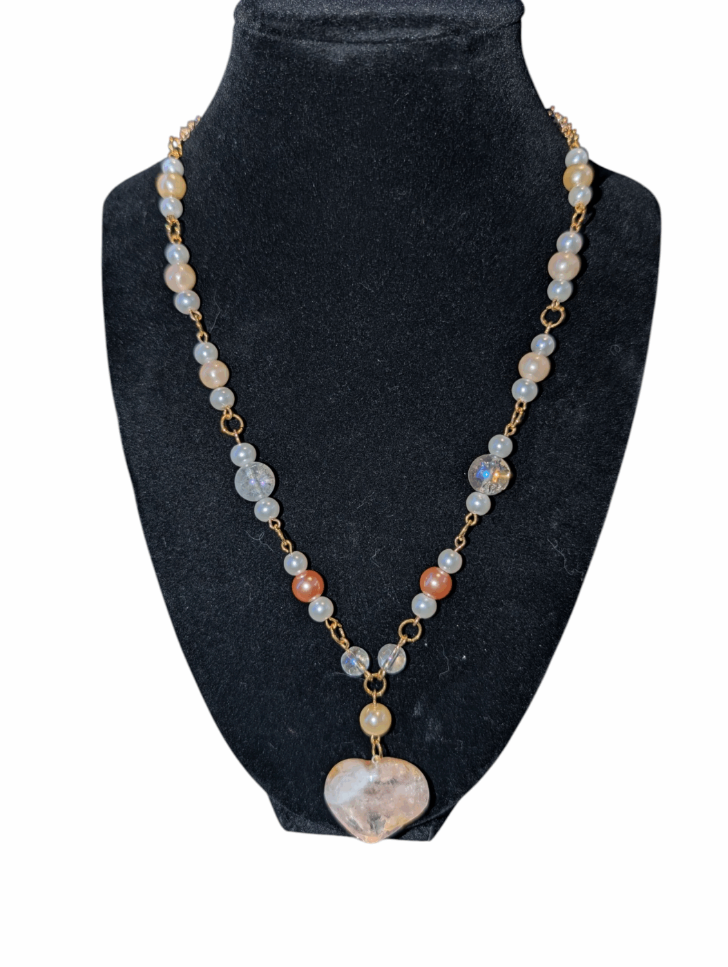 The crystal heart necklace features a stunning polished fire Quartz heart, clear quartz beads, with a blend of orange and cream to tie everything together. Made in Gold