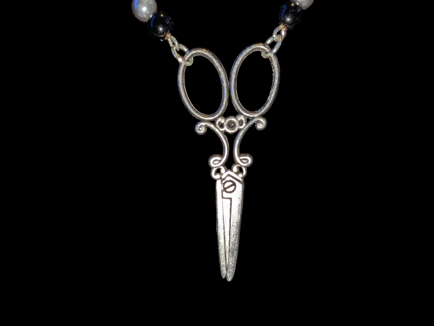 Cutting charm features Malaysia Jade, black and grey faux pearls, as well as metal flower charms that add a delicate touch to the necklace. The main pendant is a Silver pair of scissors, Cutting Charm is perfect for any crafty person!