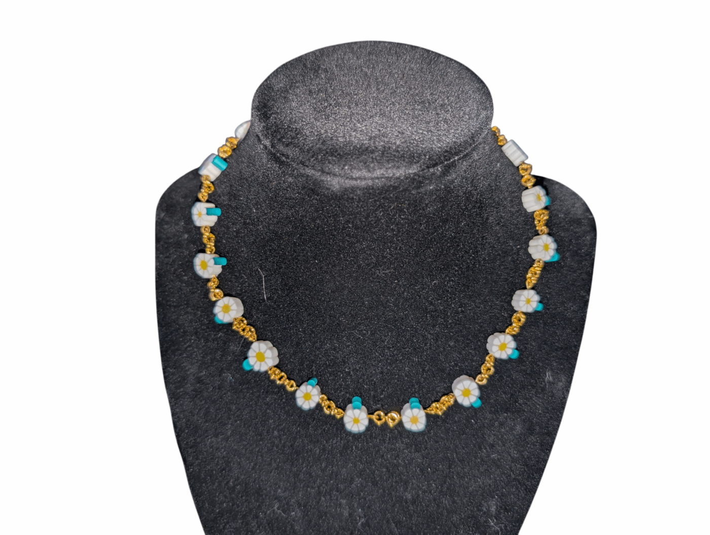 This Gold chain-mailed necklace has cute clay flowers and is sure to bring summer vibes even in the darkest winters.