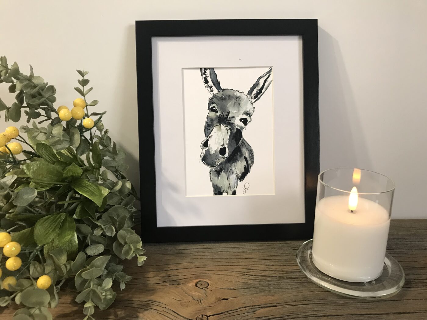 My rural roots inspired me to do this farm series. The “in your face” animals bring lots of laughter and smiles. The donkey (Fiona) is from a friend’s farm. Watercolours and ink pen that I have printed on 100lb quality paper.