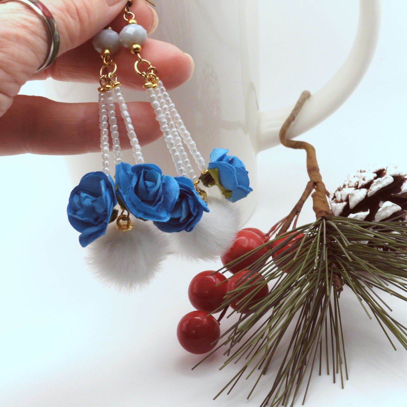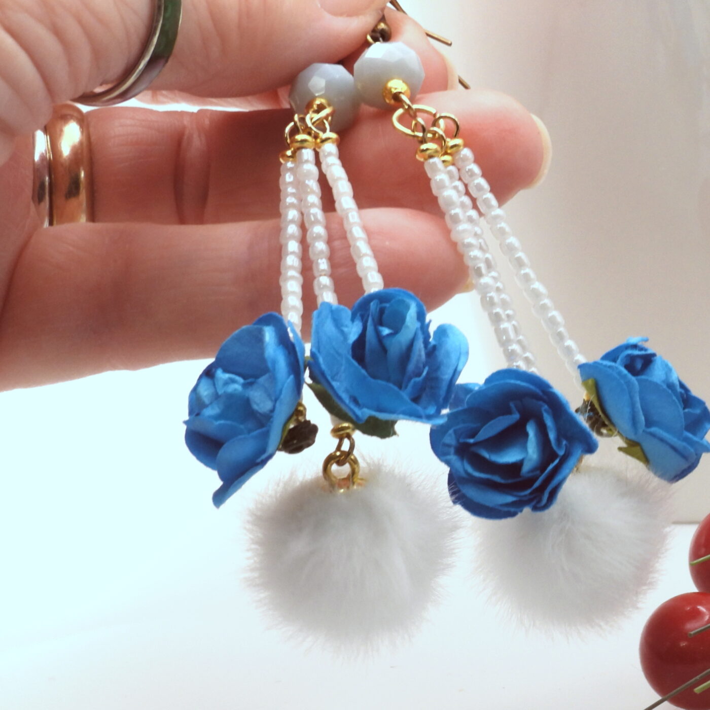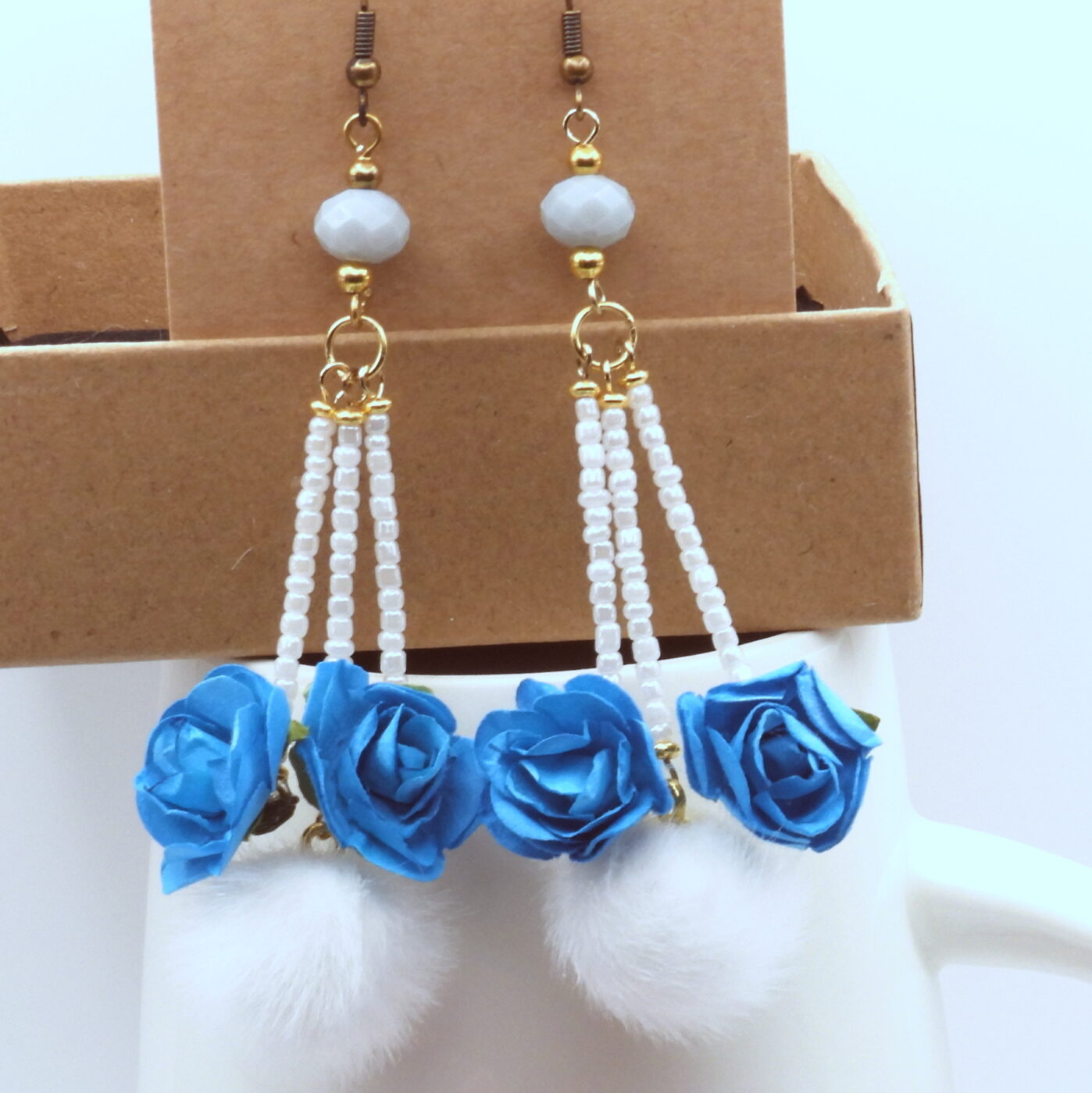 Fluffy pom pom dangle, drop earrings. Adorable plush pure white faux fur with tiny intense blue paper roses as accents. Faceted crystals top these earrings with long dangles of pearl white seed beads. The earrings measure approx. 2 ½ inches from the tops of the earwires. You’ll love these one-of-a-kind earrings. Similar earrings can be found in my shop.