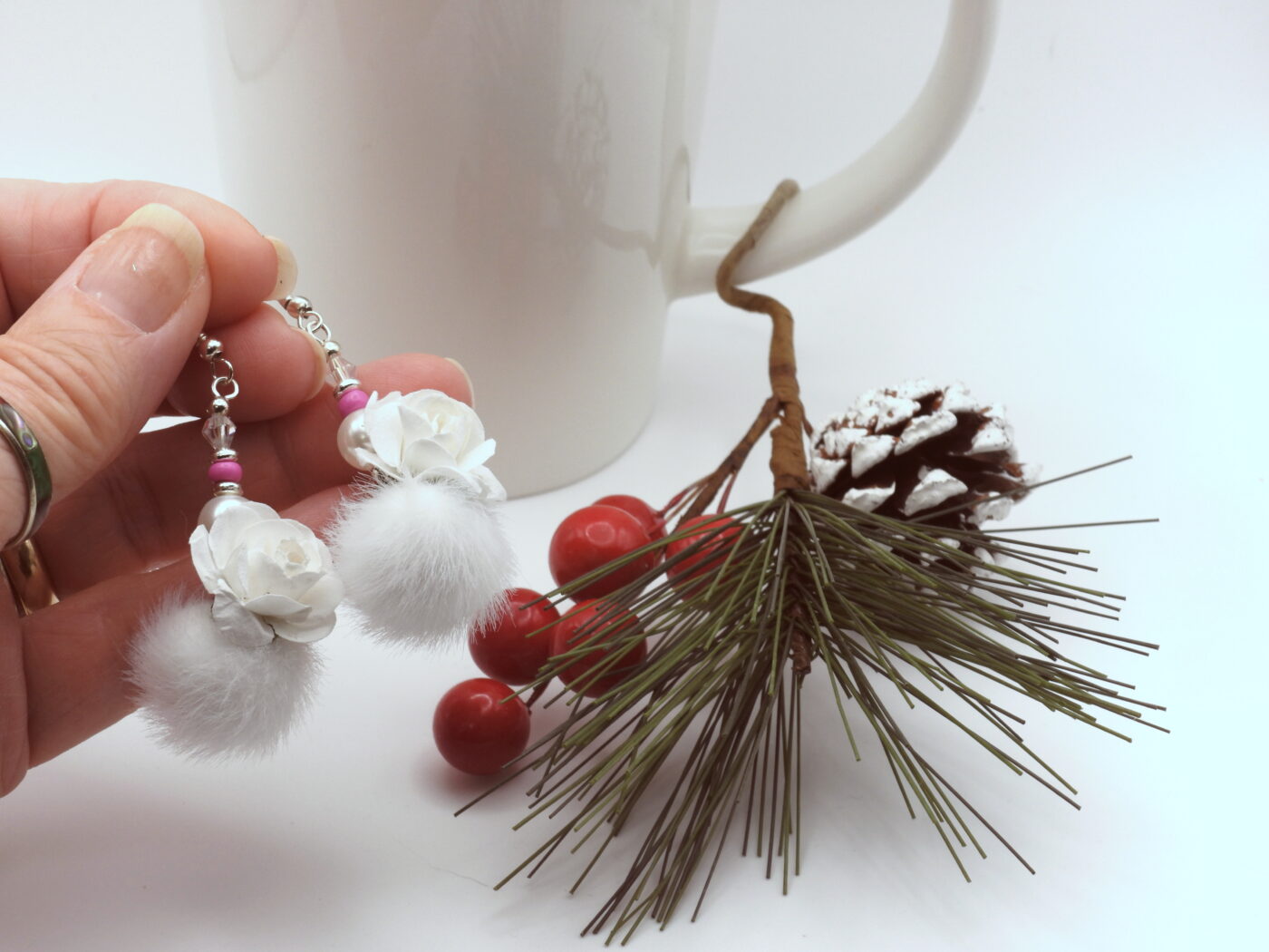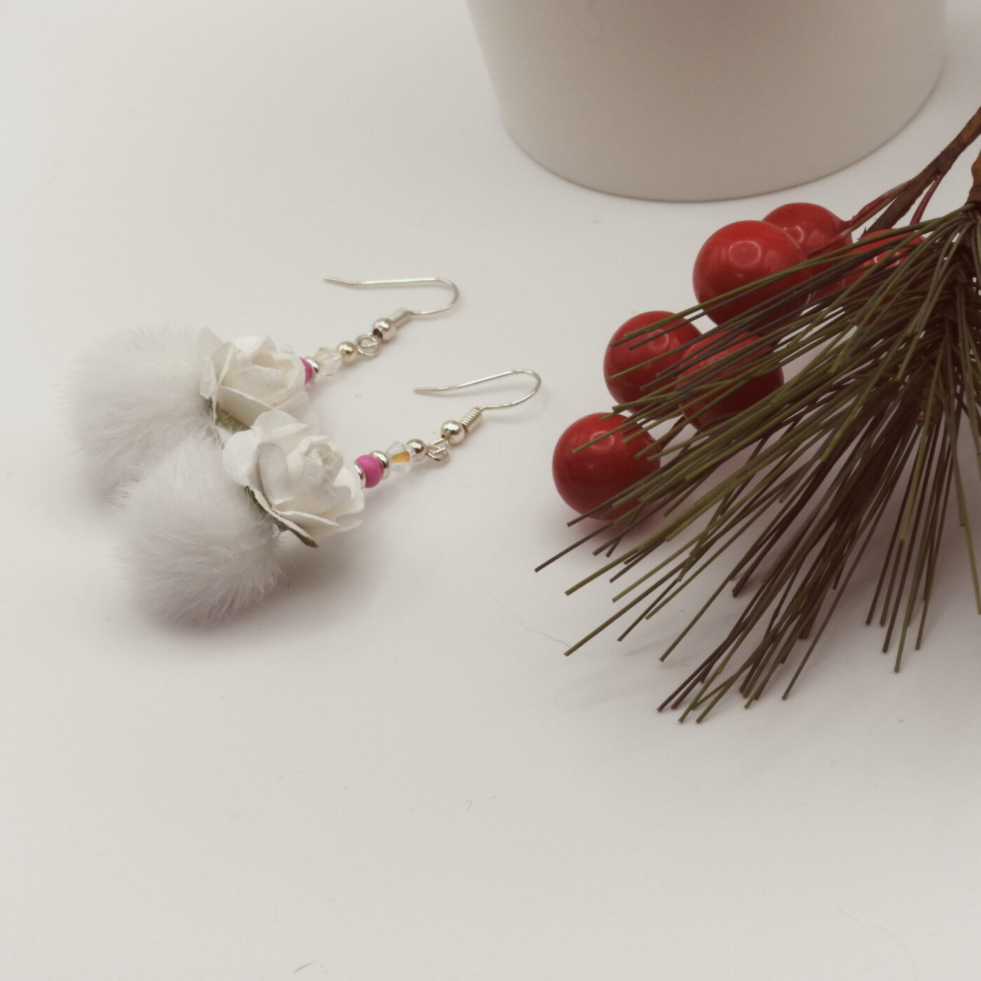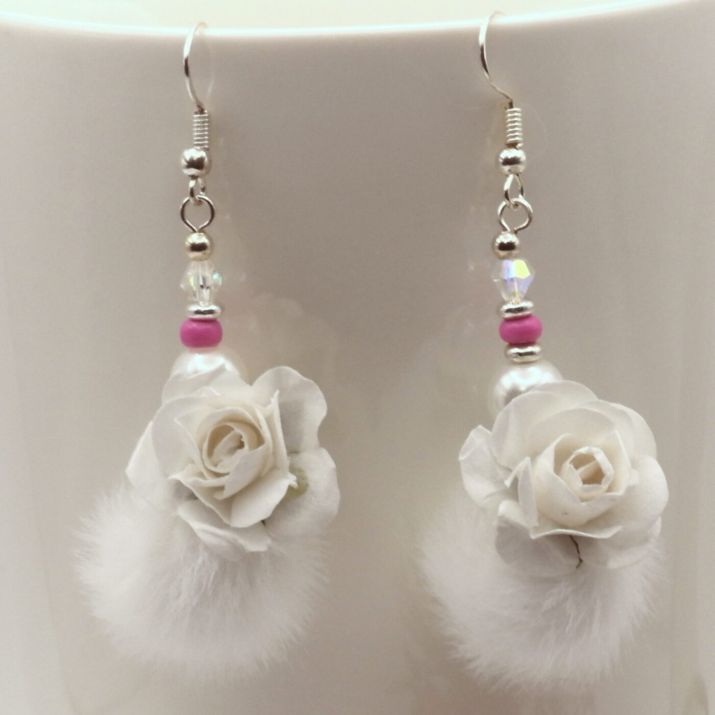 Fluffy pom pom dangle, drop earrings. Adorable plush pure white faux fur with tiny white paper roses as accents, Swarovski crystals for that extra sparkle and shine, and pink beads with lovely white pearl beads. The earrings measure approx. 2 inches from the tops of the earwires. You’ll love these one-of-a-kind earrings. Similar earrings can be found in my shop.