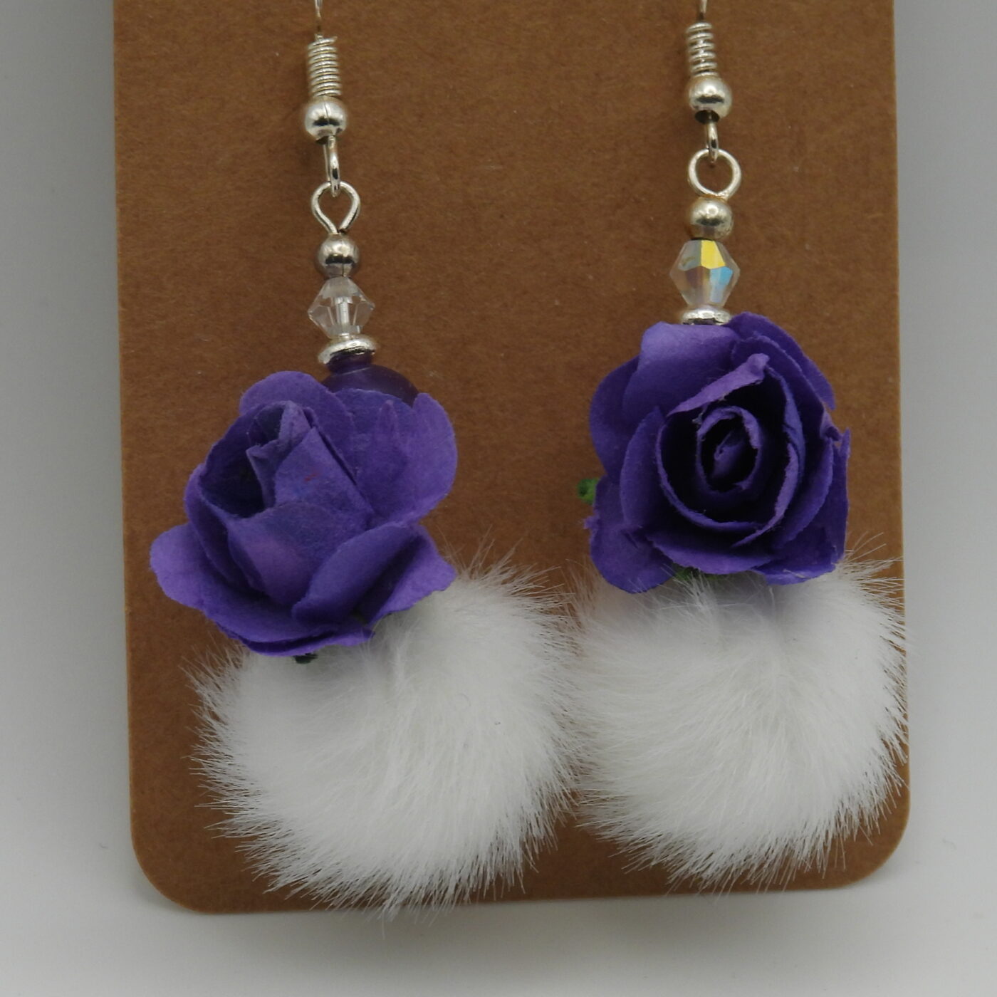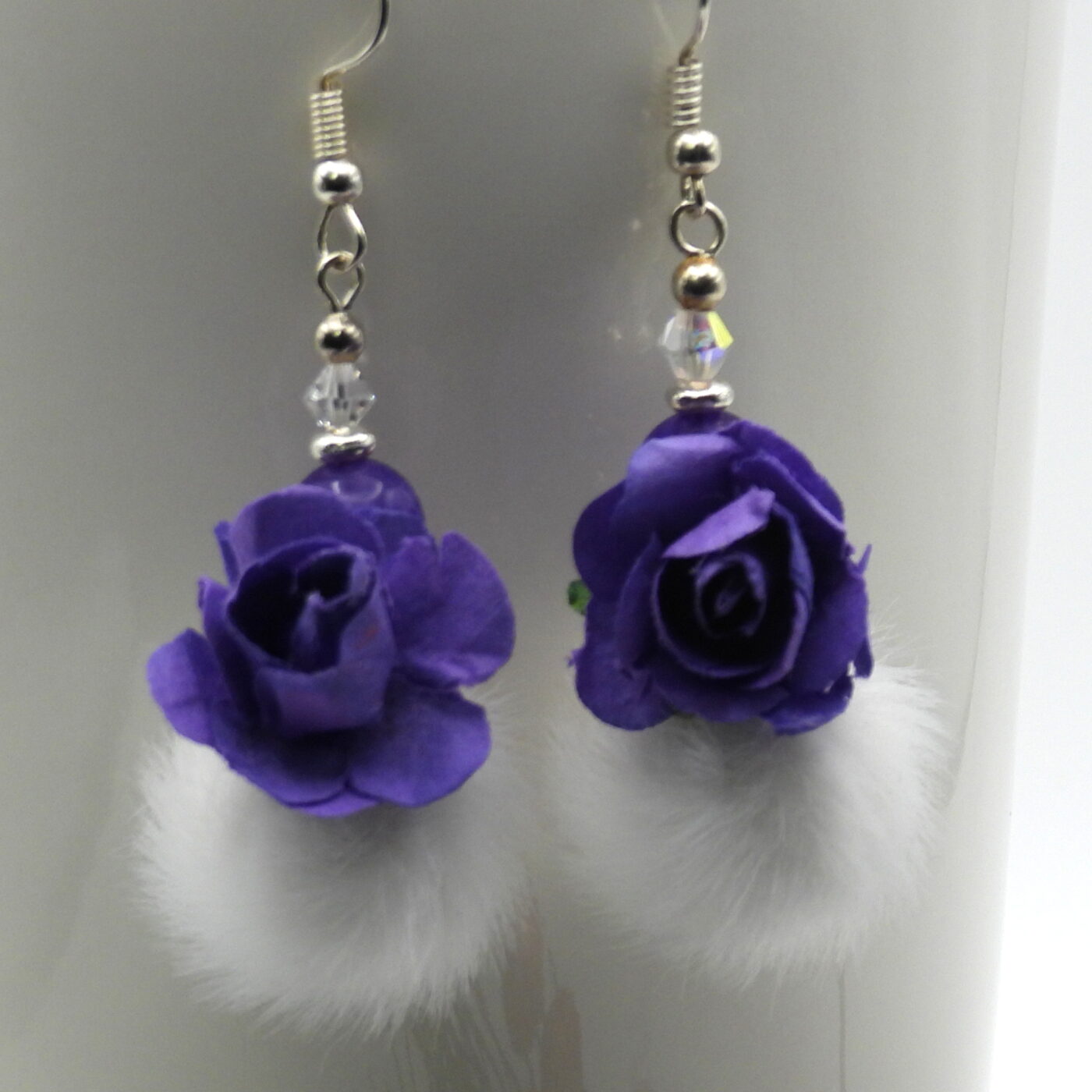Fluffy pom pom dangle, drop earrings. Adorable plush pure white faux fur with tiny paper roses as accents, with Swarovski crystals for that extra sparkle and shine. The earrings measure approx. 2 inches from the tops of the earwires. You’ll love these one-of-a-kind earrings. Similar earrings will be available in my shop.