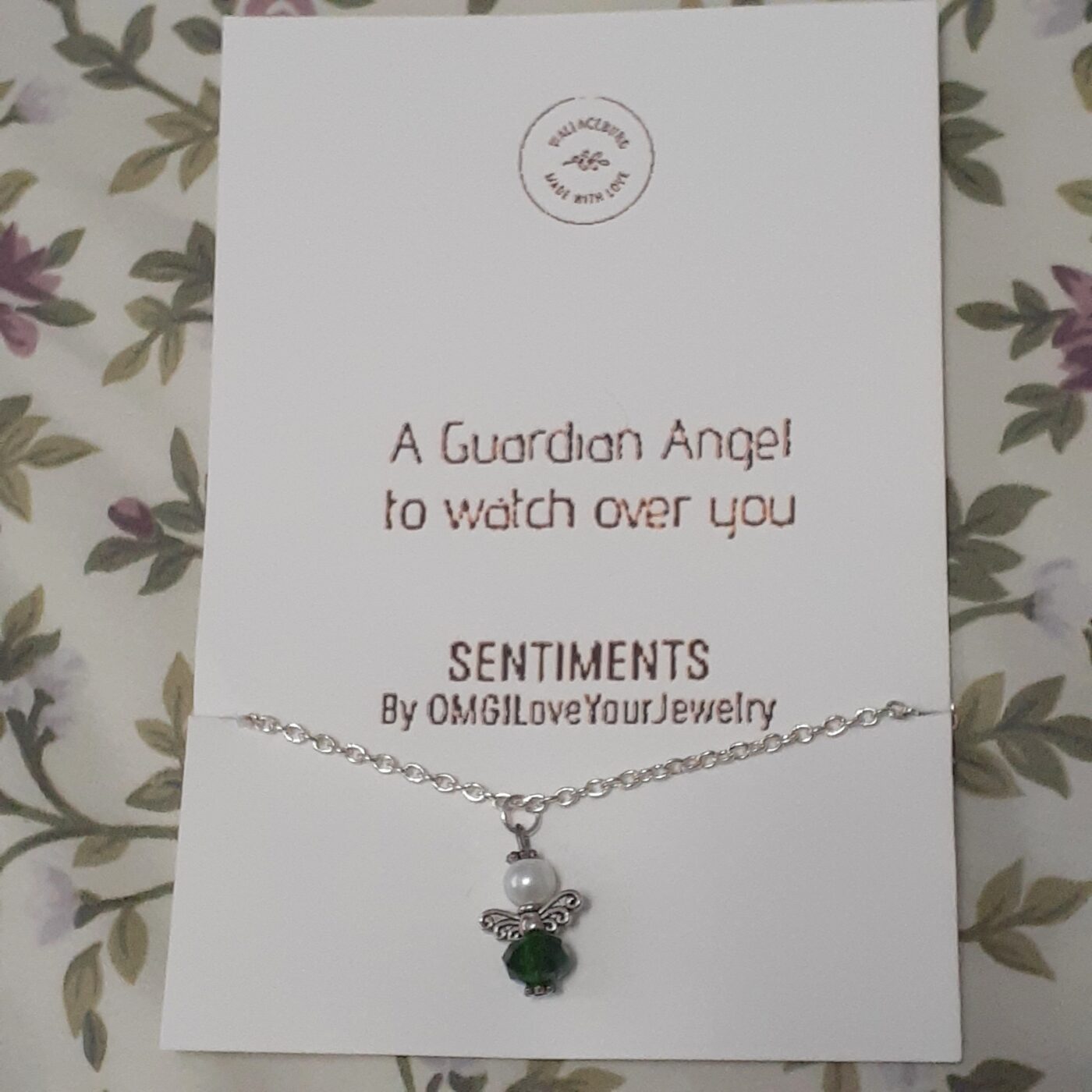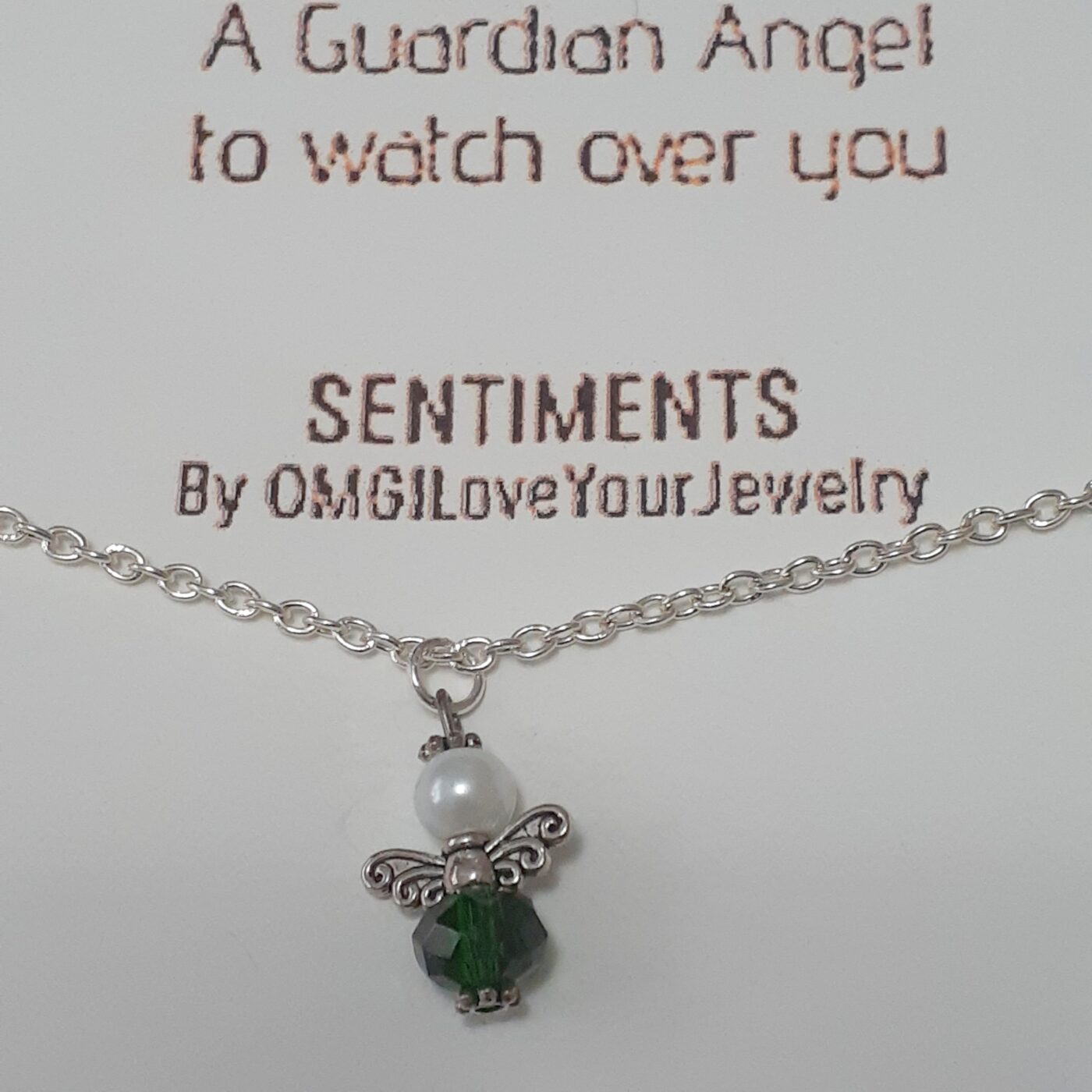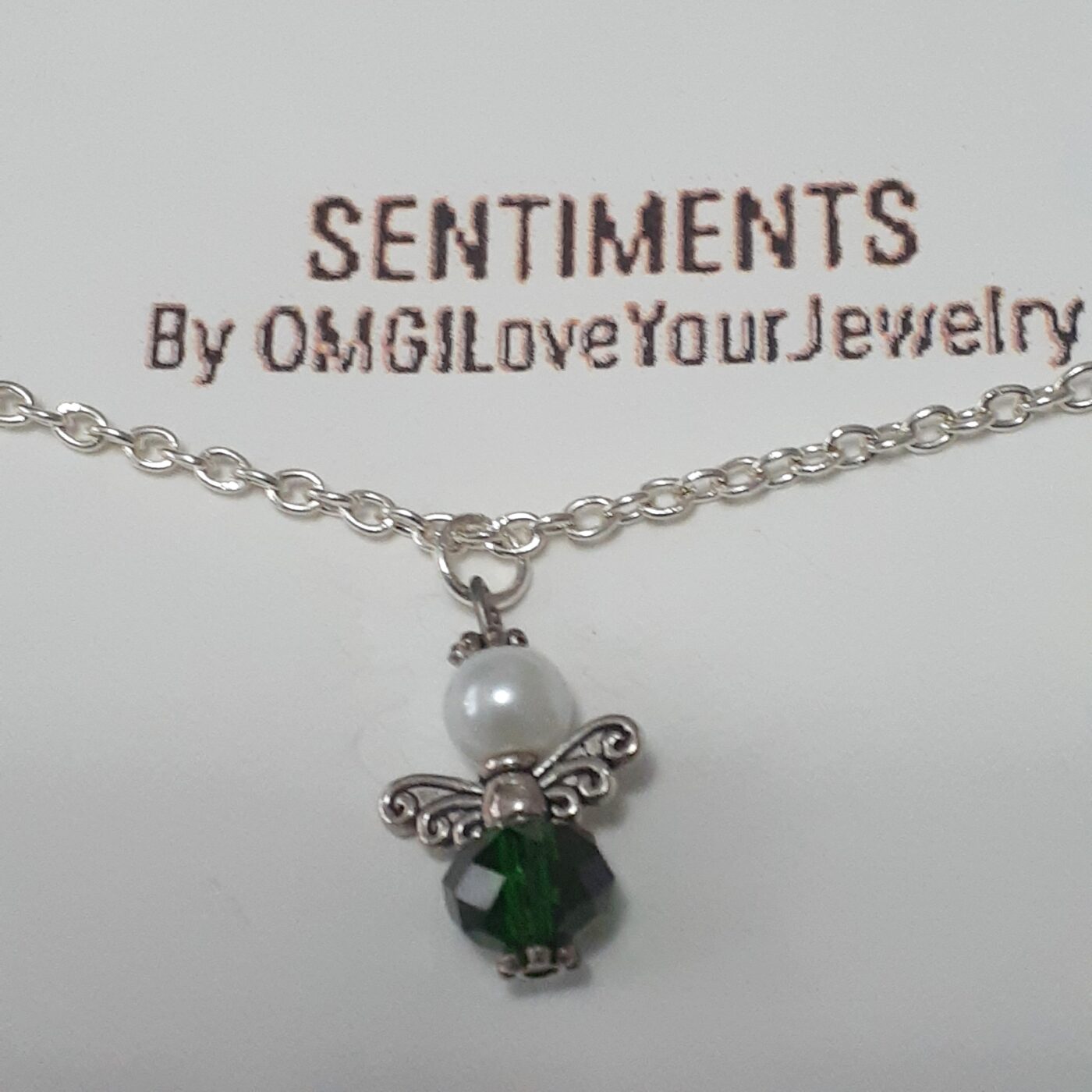 Sentiments Collection ~ Sterling silver Guardian Angel Necklace with an emerald green angel handmade by me with pearl and Czech crystals. A guardian angel to watch over you. The sterling silver necklace measures 18.5 inches long but I can make it to suit. Please contact me.
