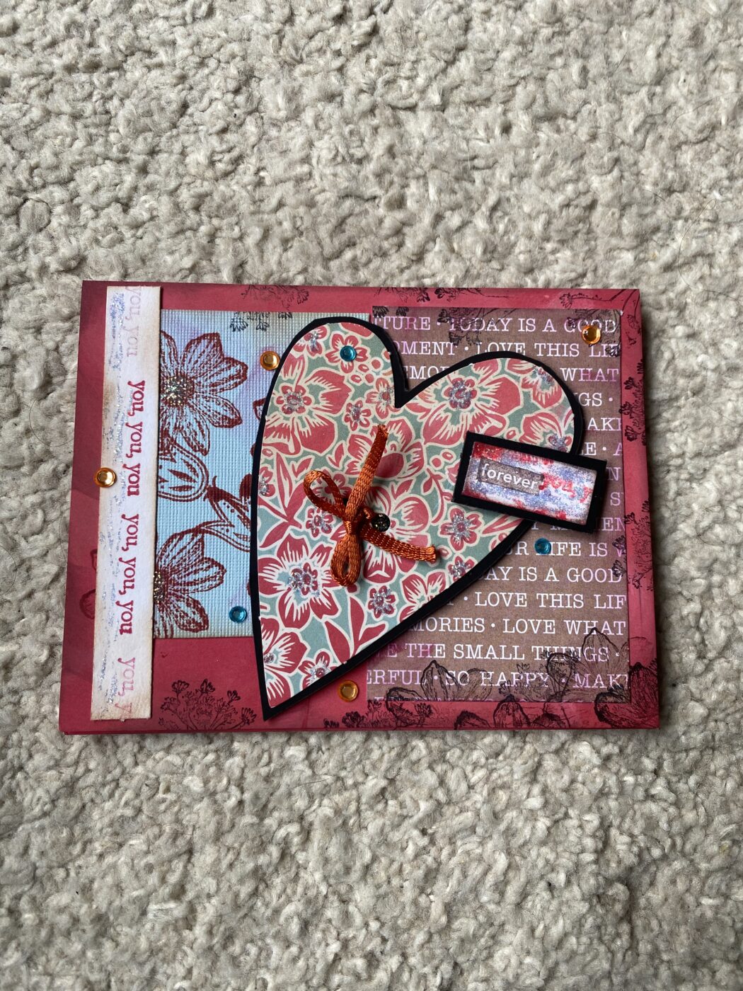 A beautiful hand made and sentimental card using a variety of media like gem stones, ribbon, stamped messages, and more. The perfect way to show that special someone how much they are loved. The outside has a collage of love messages A bright and colourful design that is sure to bring a smile to someone’s face. Blank inside so you can customize your own sentiment. Includes an envelope.