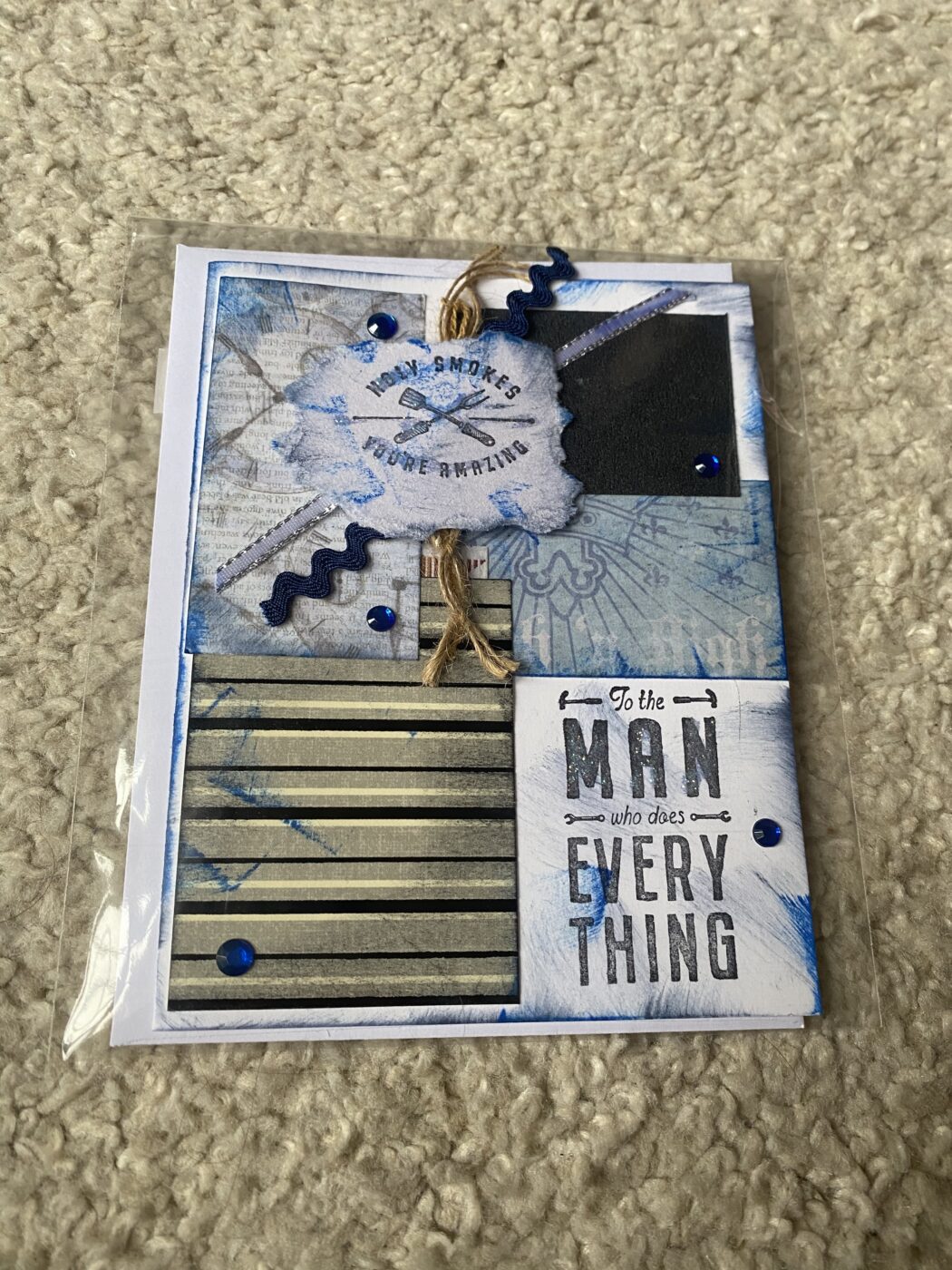 A beautiful hand made and sentimental card to celebrate the special dad in your life. Designed with beautiful embellishments. The outside message: “To The Man Who Does Everything.” Blank inside so you can customize your own sentiment. Includes an envelope.