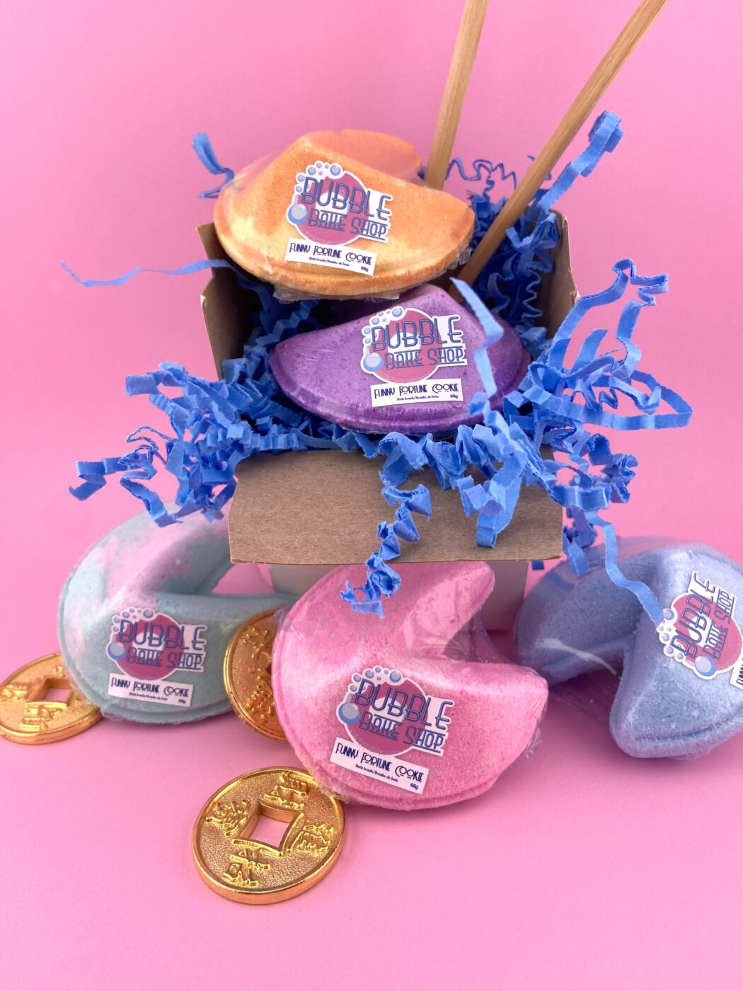 These are exclusive and original to Bubble Bake Shop. Same skin safe ingredients but in the shape of a full size fortune cookie. Rather than finding a fortune inside, you will find a kid friendly “Dad Joke.” Jokes are printed on a vinyl material so as not to dissolve in the bath.