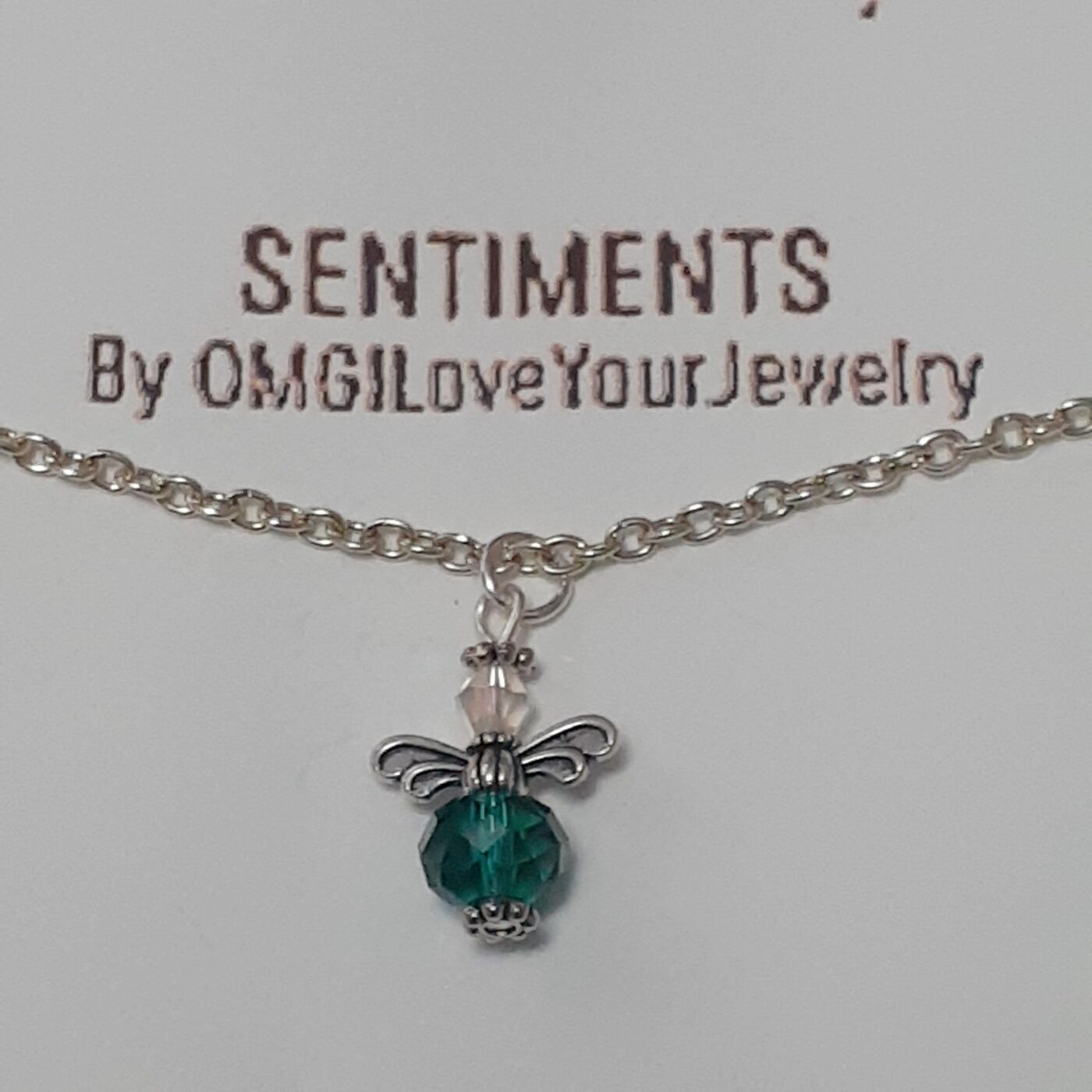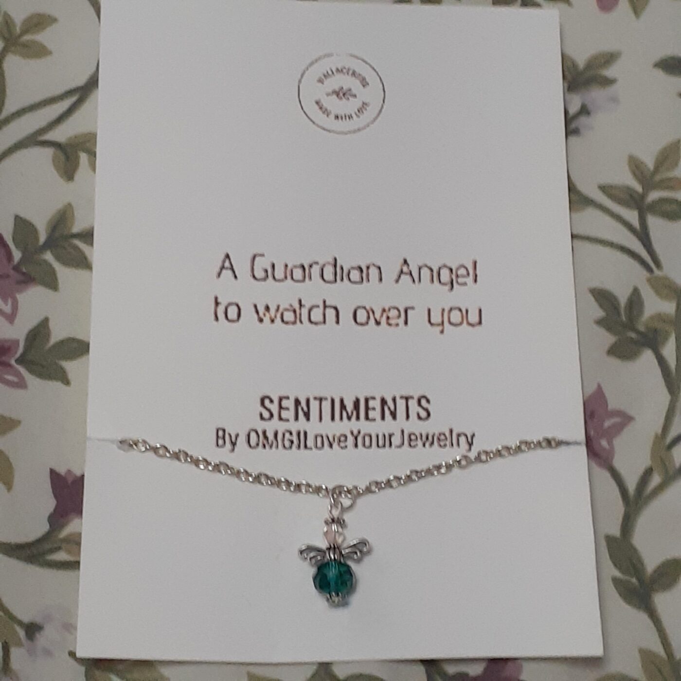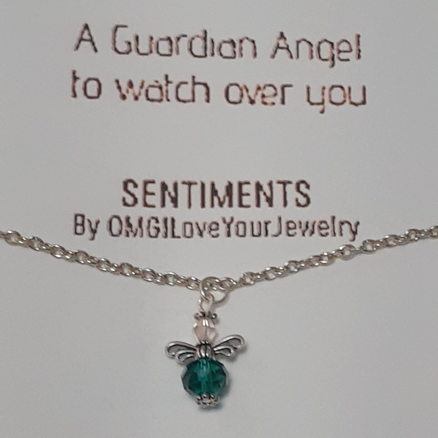 Sentiments Collection ~ Sterling silver Guardian Angel Necklace with an angel handmade by me with Swarovski and Czech crystals. A guardian angel to watch over you. The sterling silver necklace measures 18.5 inches long but I can make it to suit. Please contact me.