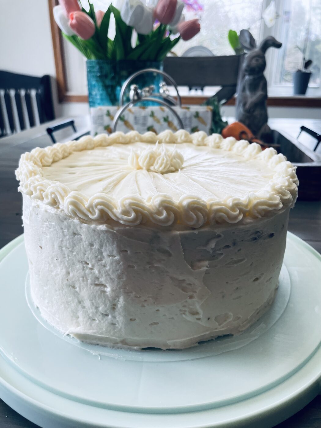 8″ round double layer with cream cheese icing.