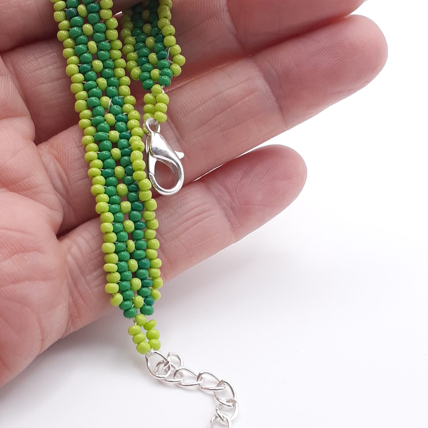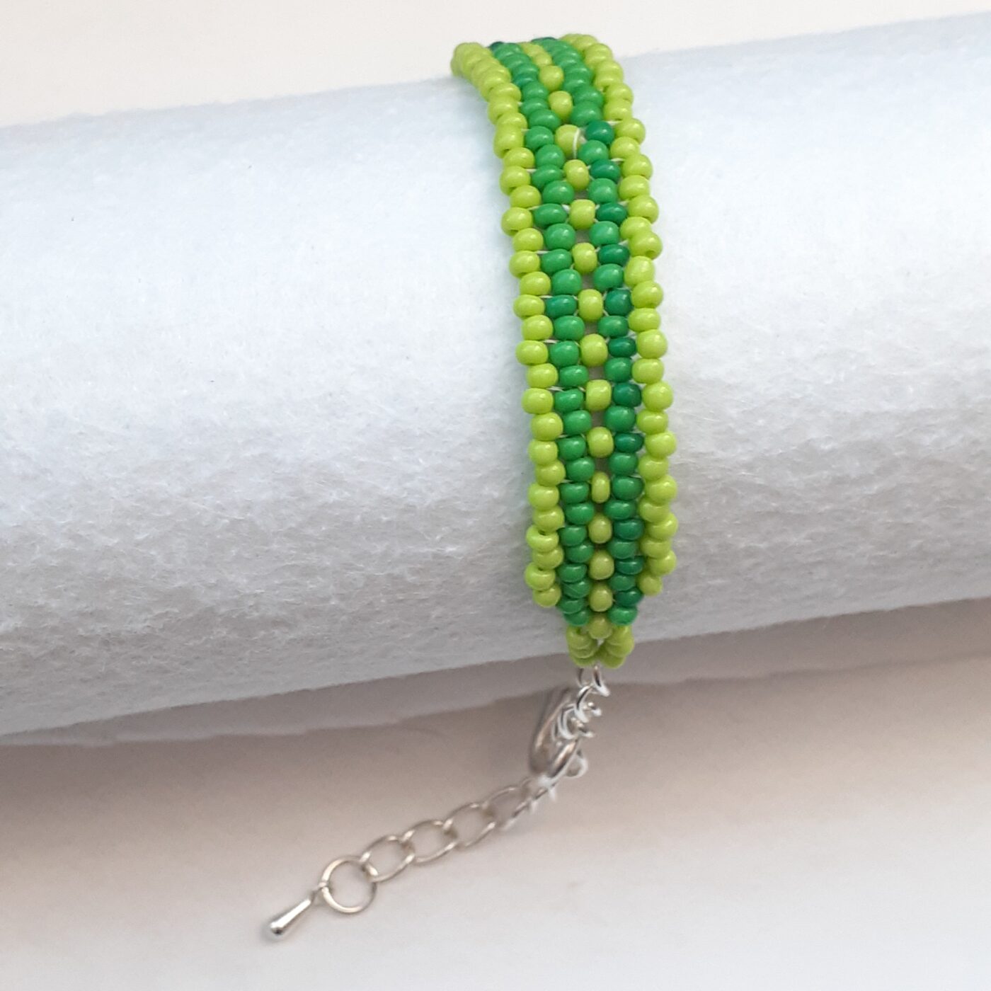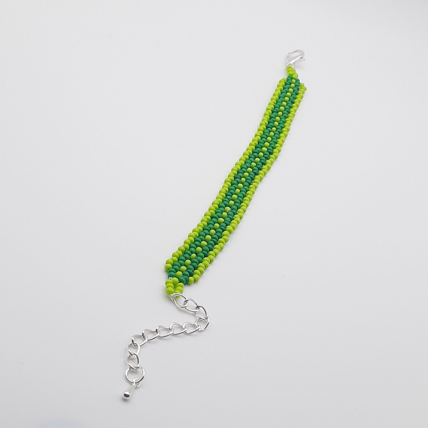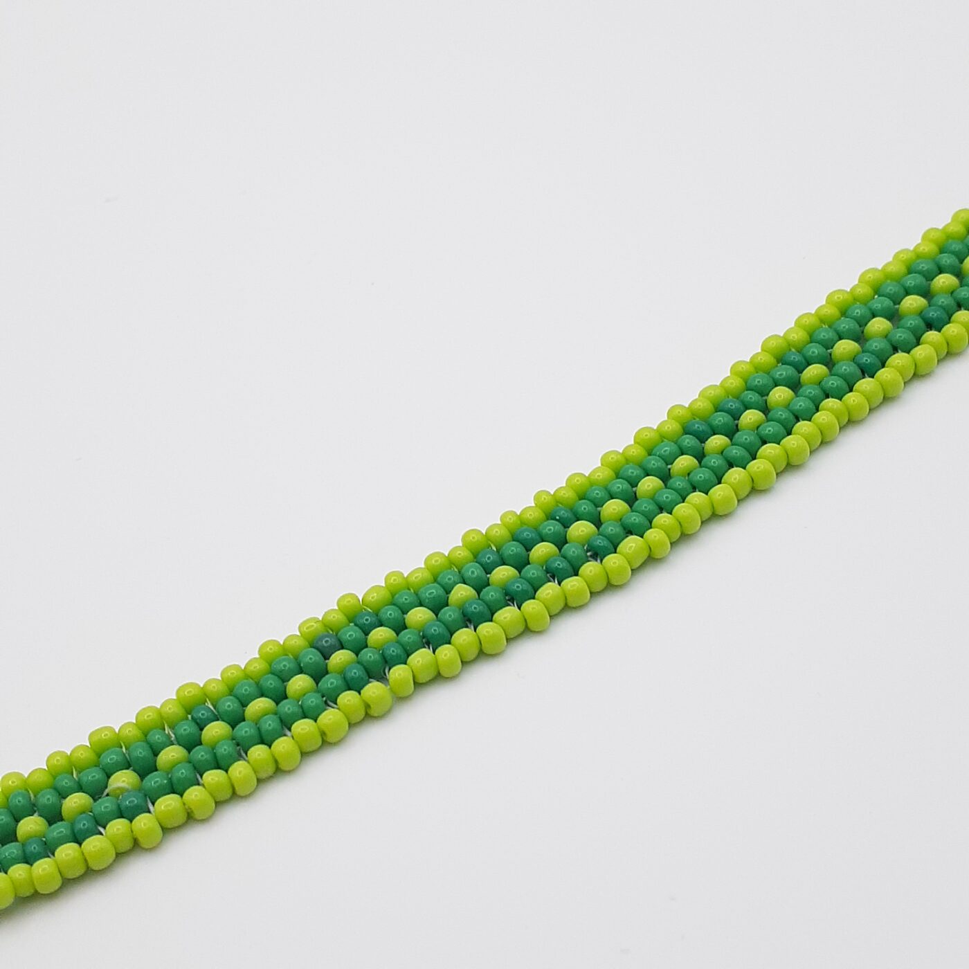 Two-toned green seed bead handwoven bracelet in light and dark green. A thin bracelet that is sewn together in a pattern that creates a very supple feel to this piece of jewelry. It is an extremely comfortable bracelet to wear. Sized to fit 5.5 – 7 inch wrists.
