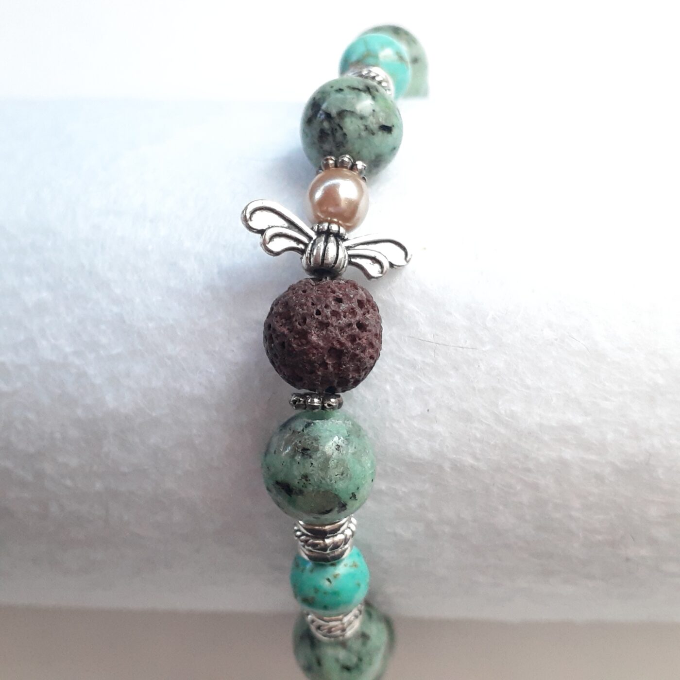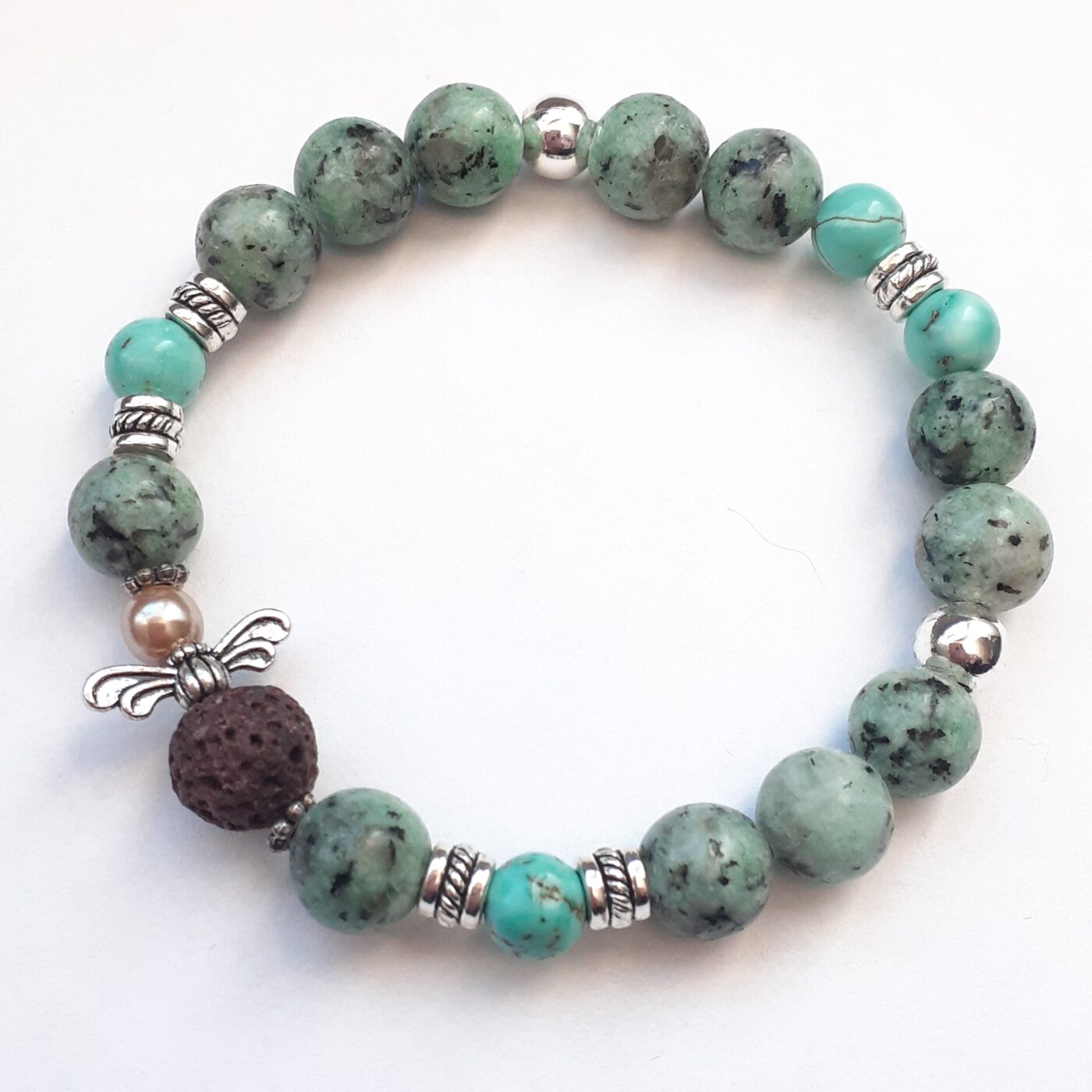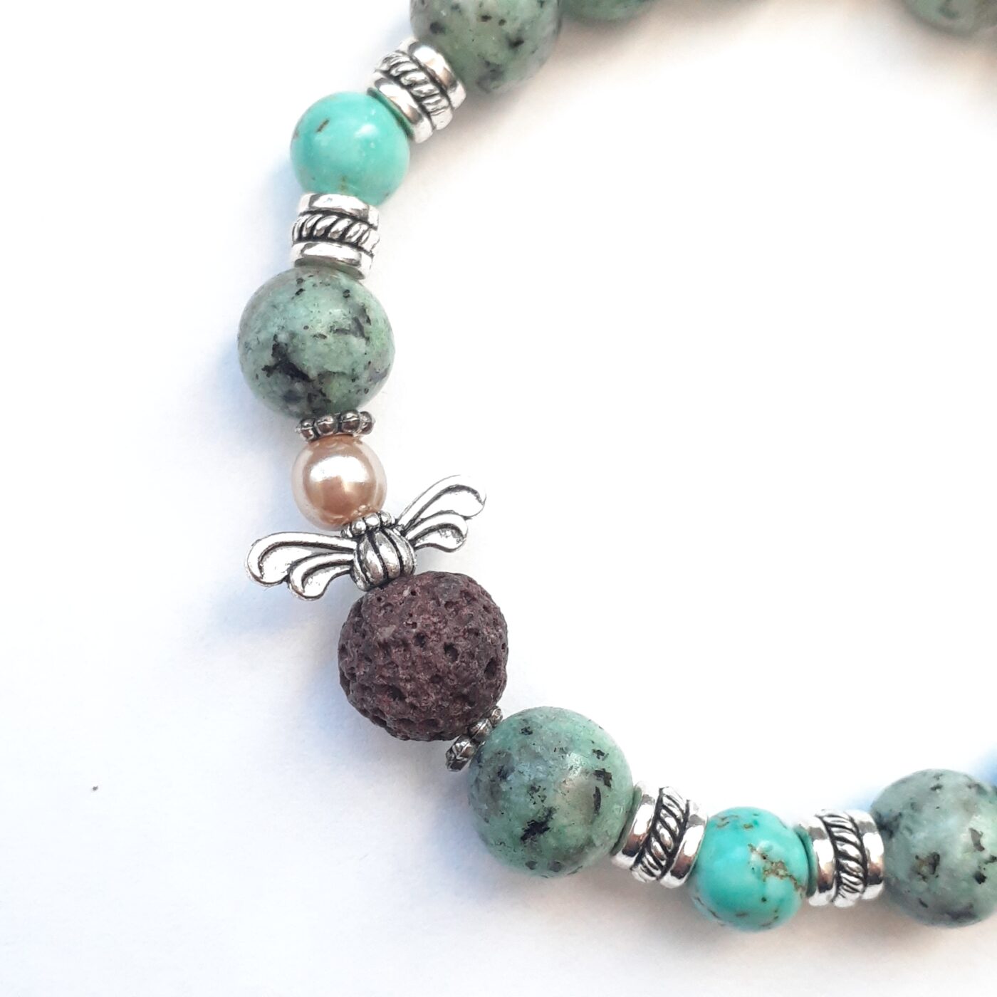 This beaded stretch bracelet with it’s little lava bead angel combines natural, earthy gemstones with functional aromatherapy components. The porous, black lava bead on the tiny angel can serve as a natural essential oil diffuser. You can add a drop of oil to these beads, which will hold the scent for hours or days. Be sure to make certain the oil you use is safe on your skin.