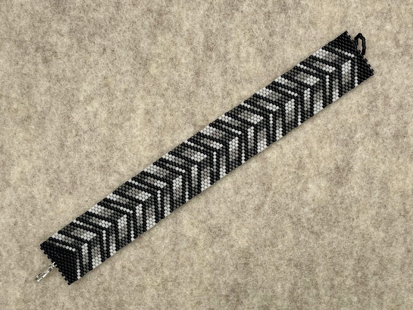This Grey Herring Bone hand-beaded bracelet measures 6.5″ x 1″