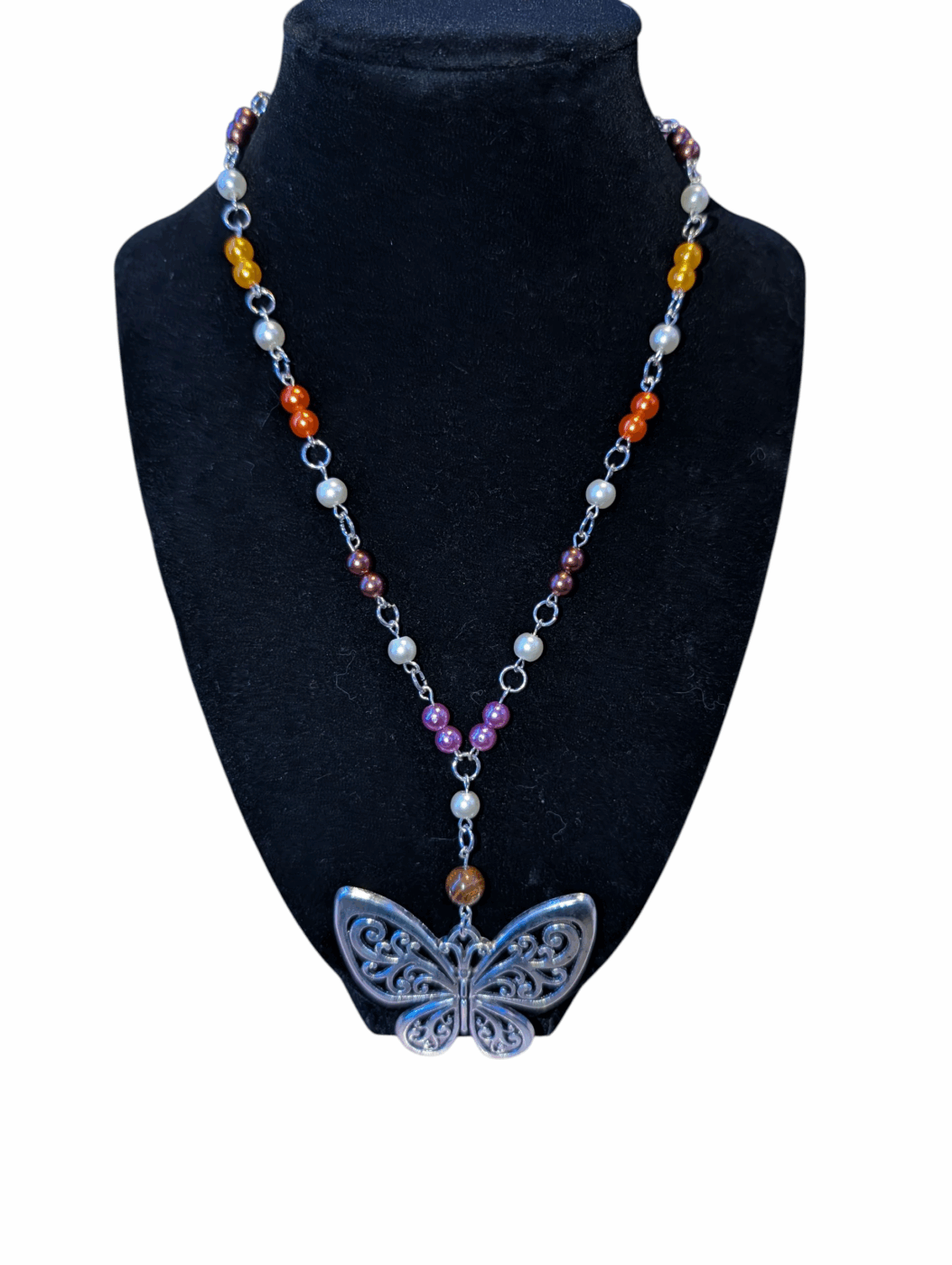This groovy butterfly necklace is sure to bring a feeling of nostalgia for anybody who loves the fun and fresh colours of this faux pearl necklace, with a Tiger’s Eye bead for courage, focus, and self-empowerment.