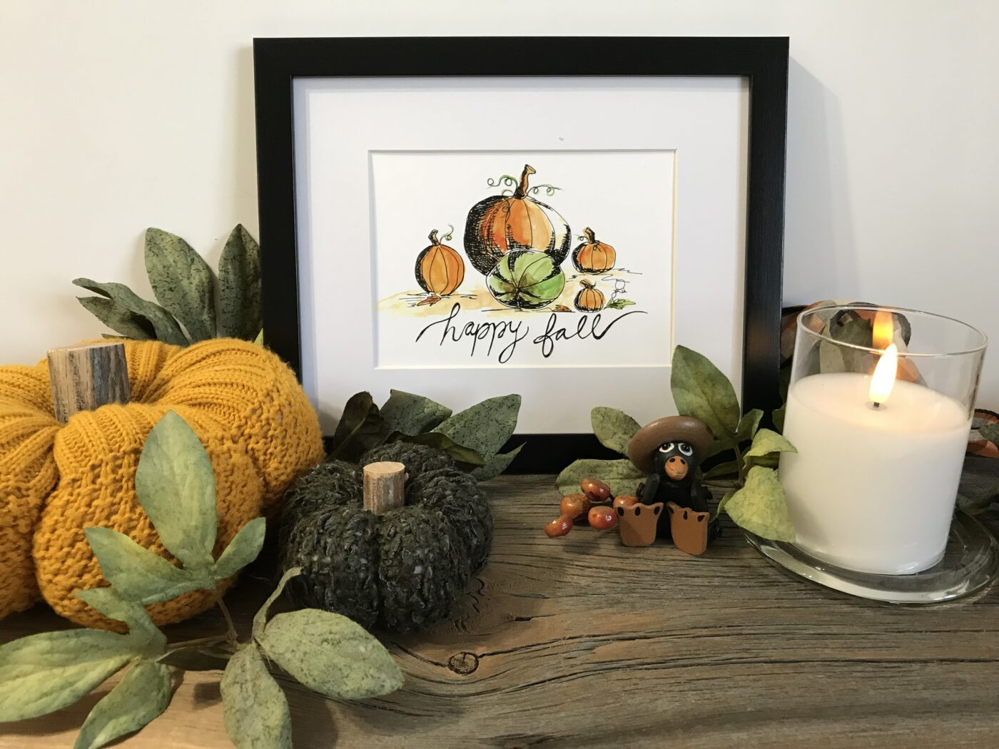 Part of my Autumn Collection. This piece captures the soft and cozy colours of Autumn, with a beautiful patch of pumpkins and a festive message: “Happy Fall”.  Such a perfect decor piece for the harvest season and beyond. Micron ink pen and watercolour design.