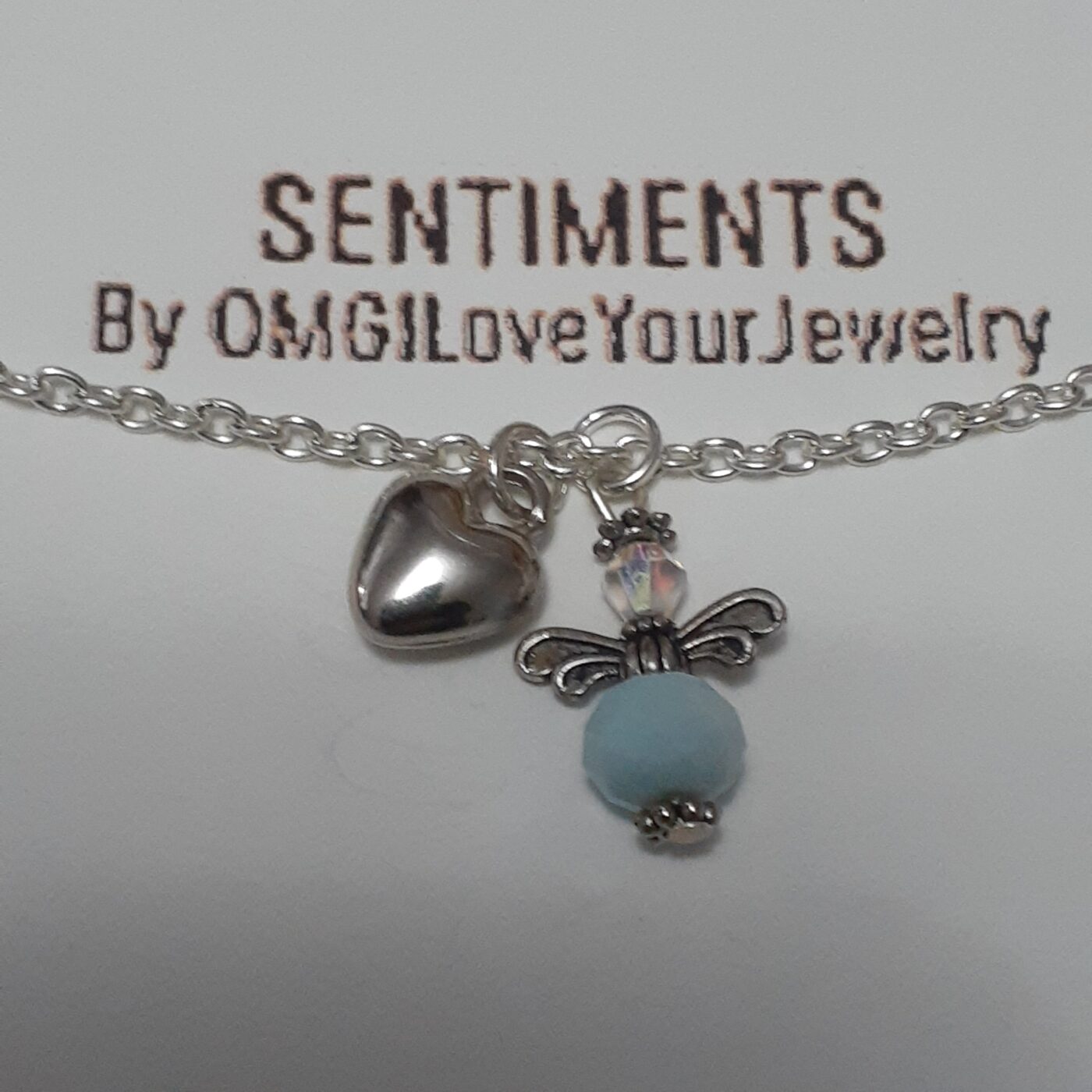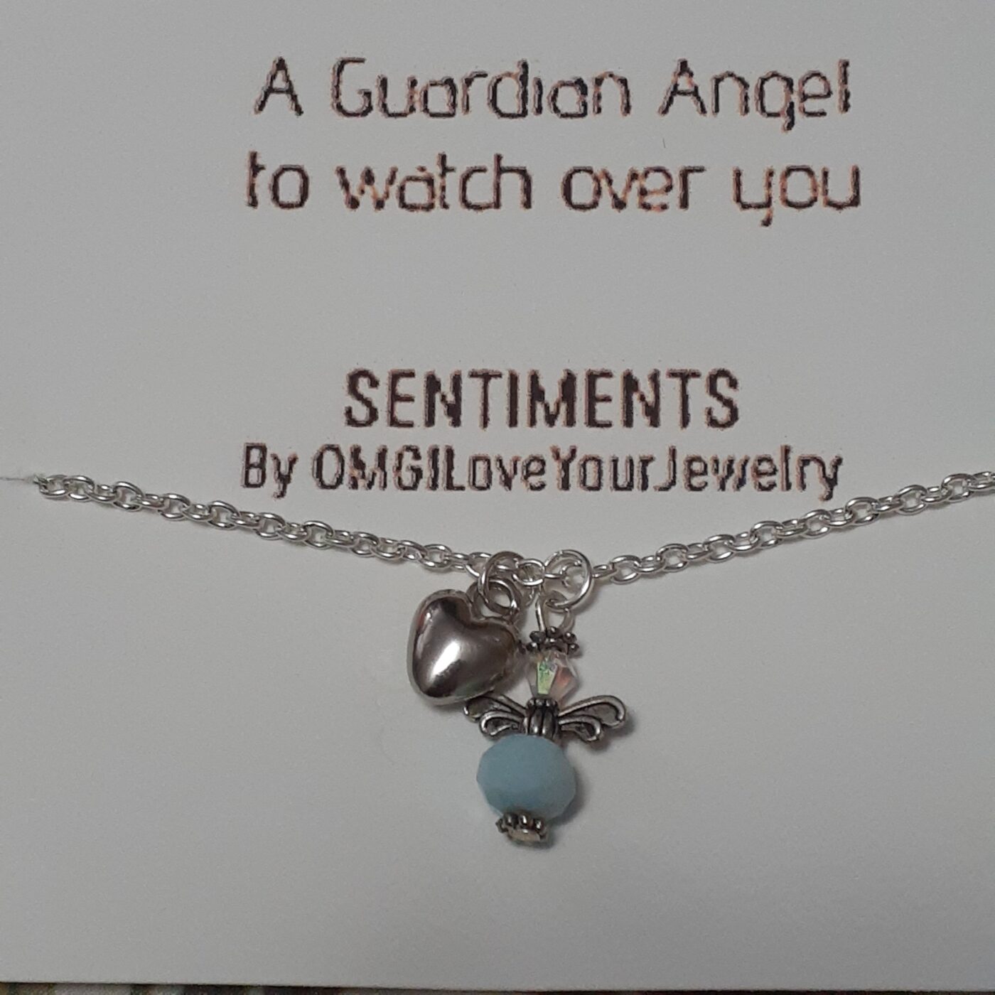 Sentiments Collection ~ Sterling silver Guardian Angel Necklace with a silver heart charm and angel handmade by me with Swarovski and Czech crystals. A guardian angel to watch over you. The sterling silver necklace measures 18.5 inches long but I can make it to suit. Please contact me.
