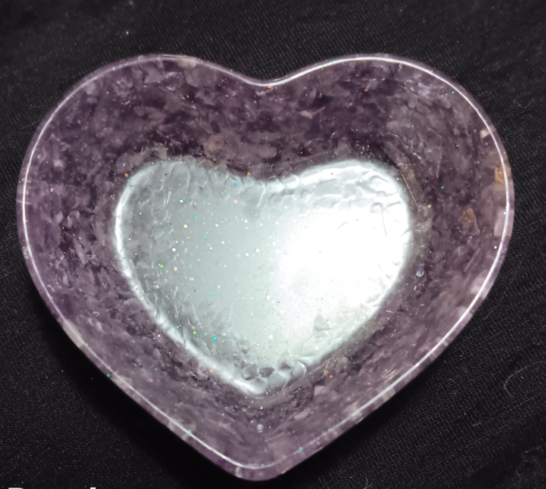 A beautiful dish to hold your trinkets. Handmade, 2” x 2 ¾” heart-shaped resin trinket dish, ¾” depth.