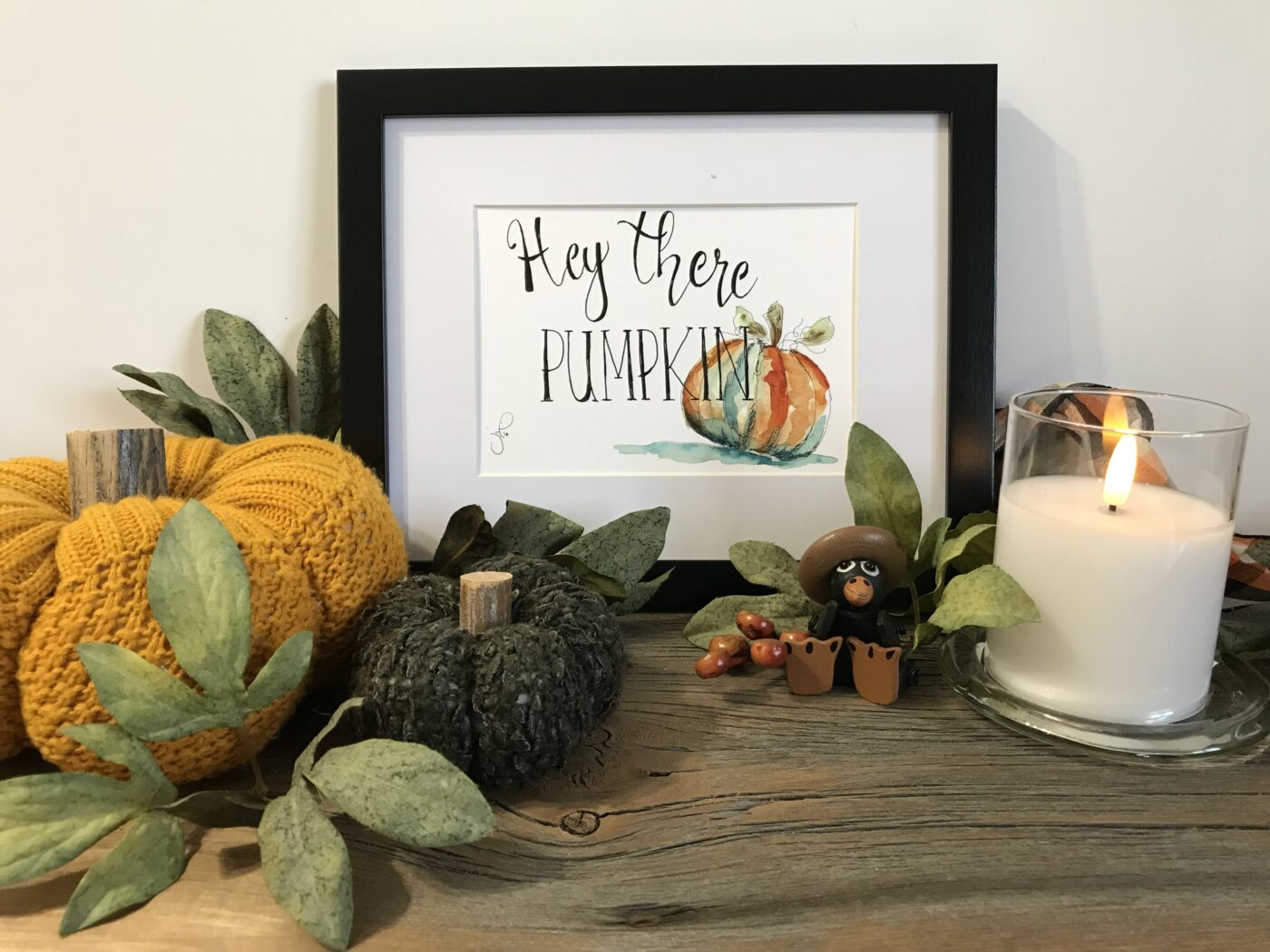 Part of my Autumn Collection. This piece captures the soft and cozy colours of Autumn, with a festive pumpkin and the message “Hey There Pumpkin”. Such a perfect decor piece for the harvest season and beyond. Micron ink pen and watercolour design.