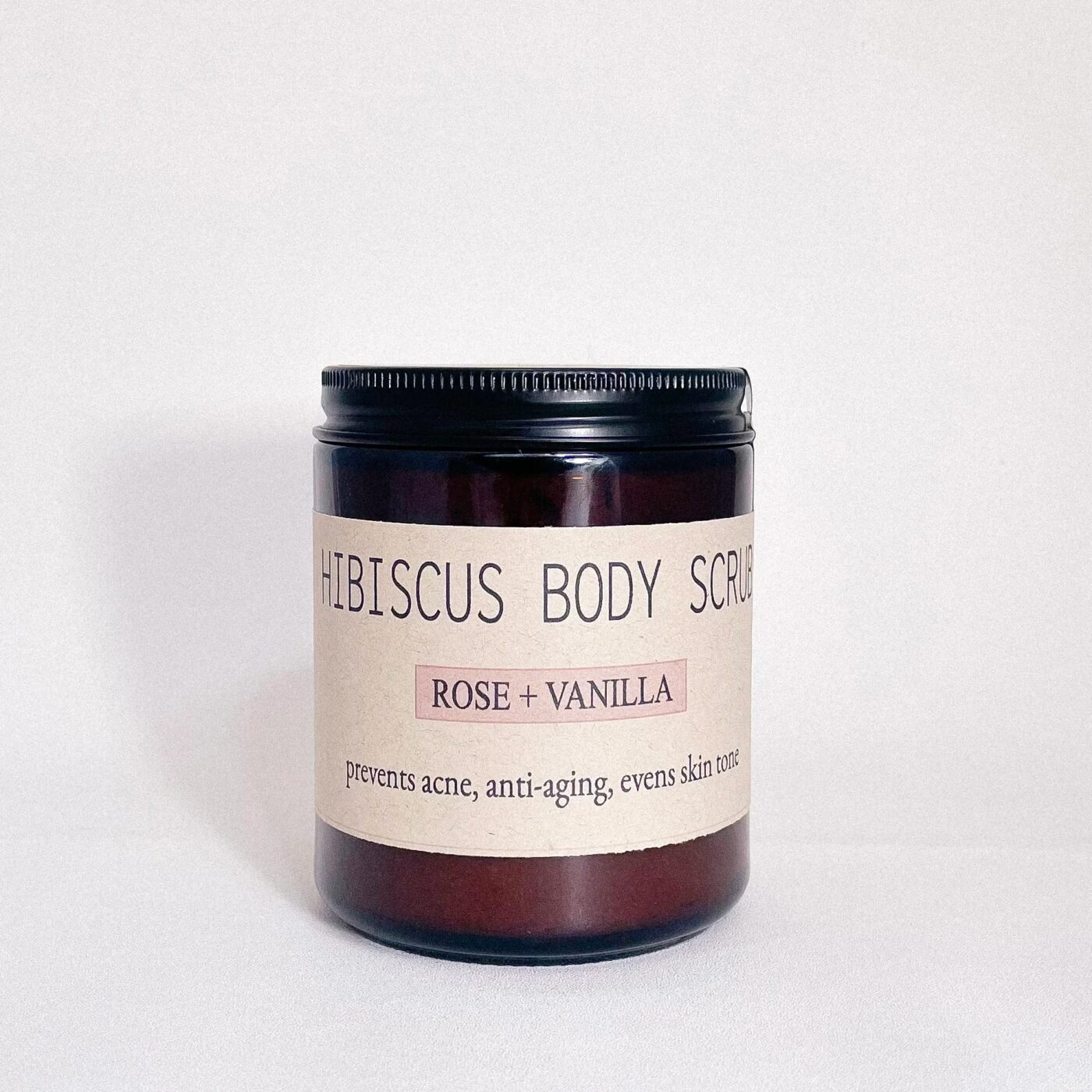 Ingredients: sugar, sea salt, shea butter, coconut oil, sunflower oil, hibiscus powder, rose & vanilla essential oil