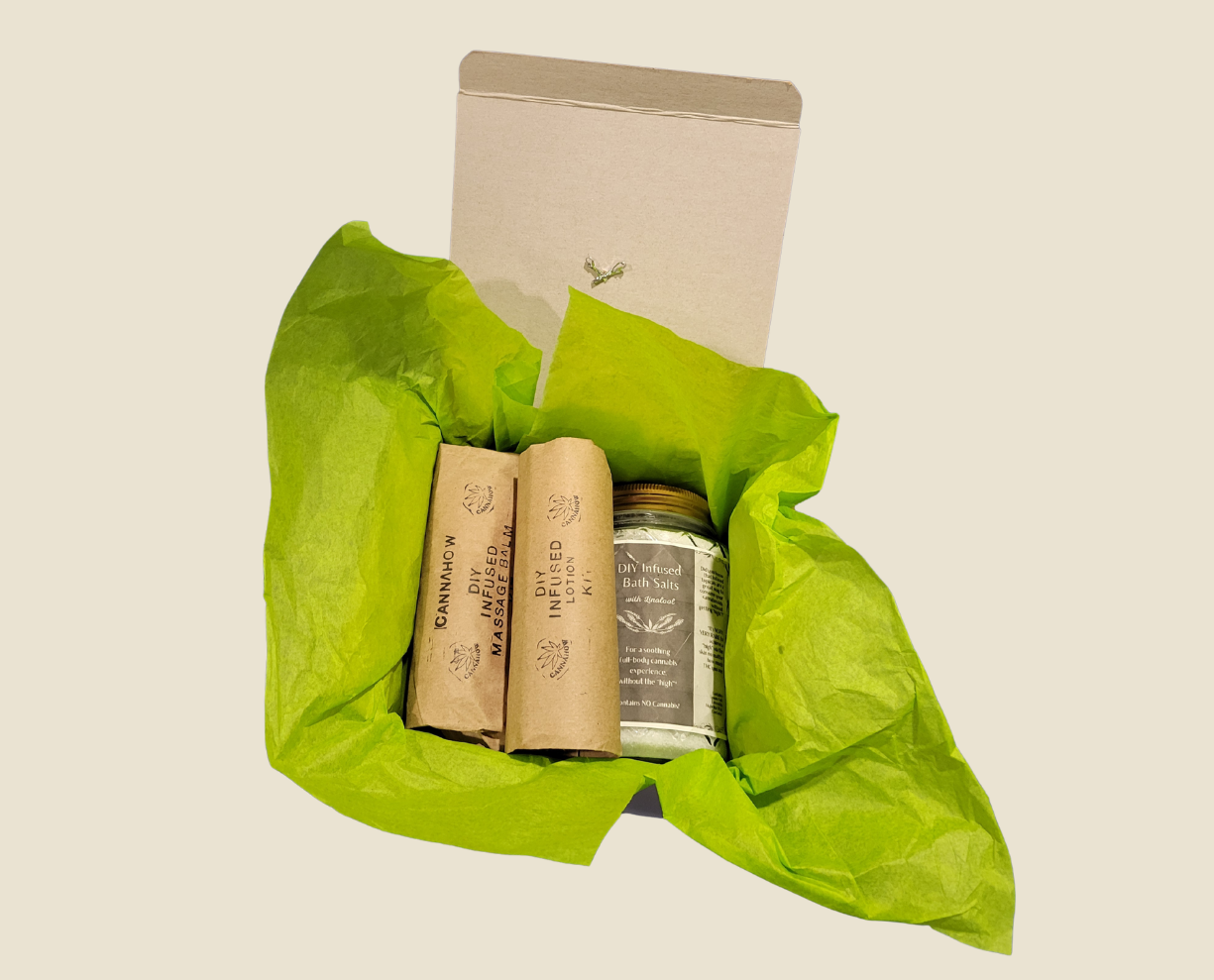 This holiday gift pack contains our 3 most popular kits: DIY Infused Lotion, DIY Infused Massage Balm, and our DIY Infused Bath Salts Kit to help you give the gift of custom care this holiday season.