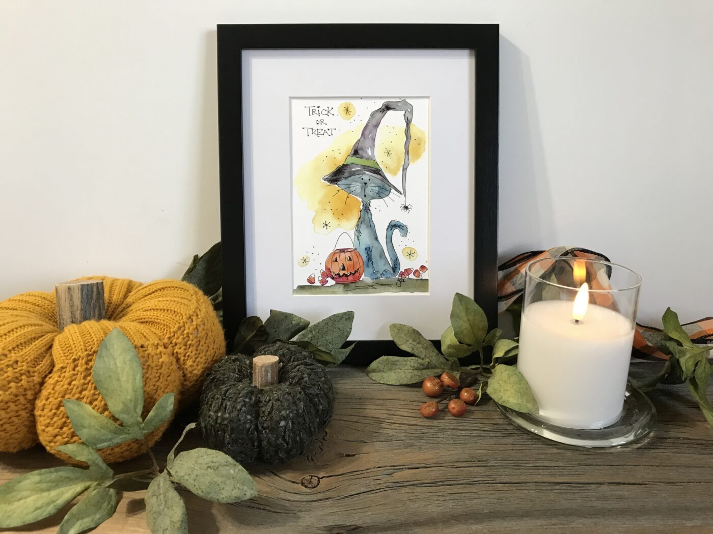 Part of my Halloween Collection. Who wouldn’t want to celebrate Halloween with this adorable cat in a witches hat waiting to trick or treat. Such a perfect decor piece for the mystical season and beyond. Micron ink pen and watercolour design.