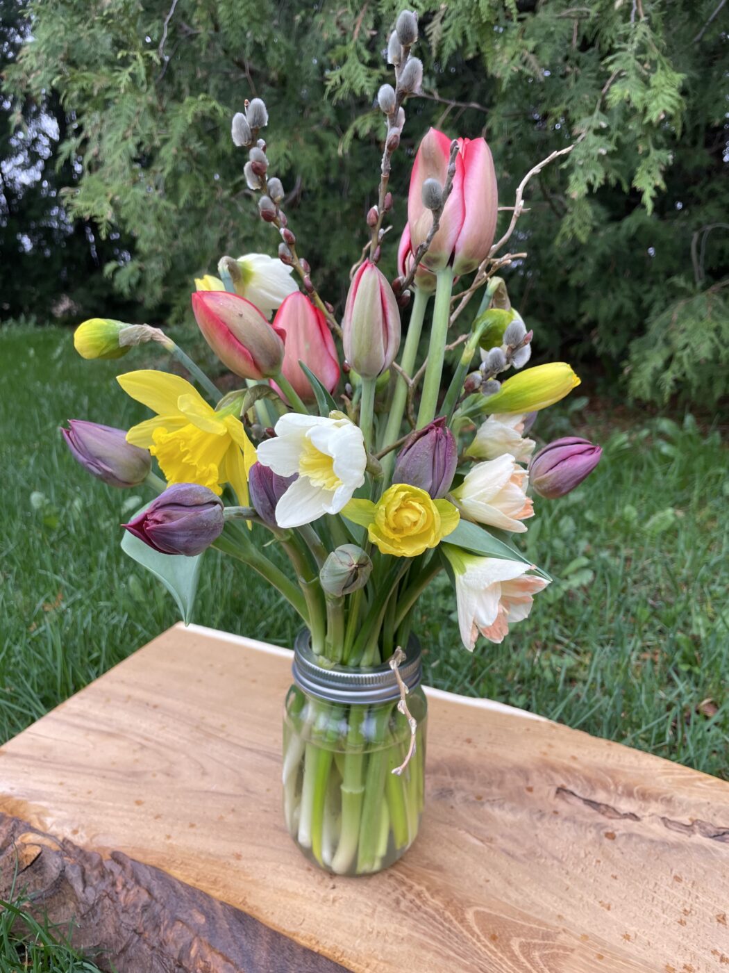 A sweet mix of springtime blooms, thoughtfully gathered and arranged in a mason jar. Featuring locally grown, seasonal flowers from the farm, each jar is unique and full of fresh colour— ideal for bringing the beauty of the season indoors or as a thoughtful gift.