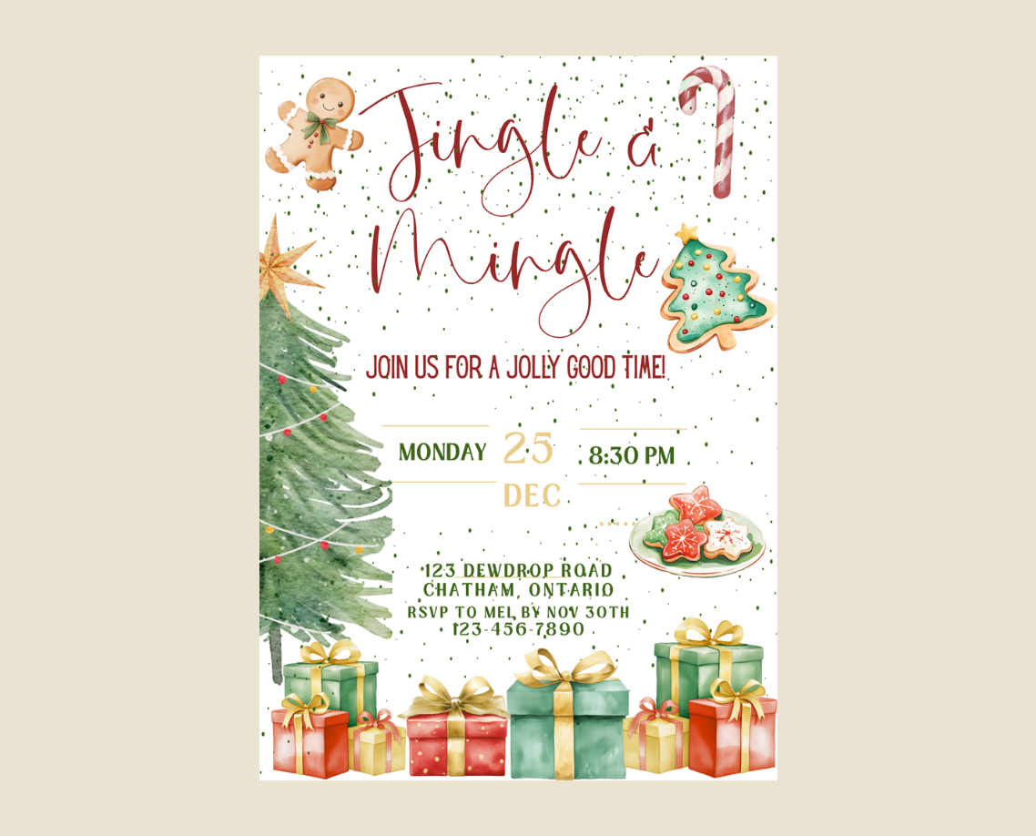 Celebrate the season with this “Jingle & Mingle” Christmas Party Invitation, printed on high-quality card stock. Perfect for inviting friends and family to a festive gathering filled with holiday cheer, laughter, and joy!